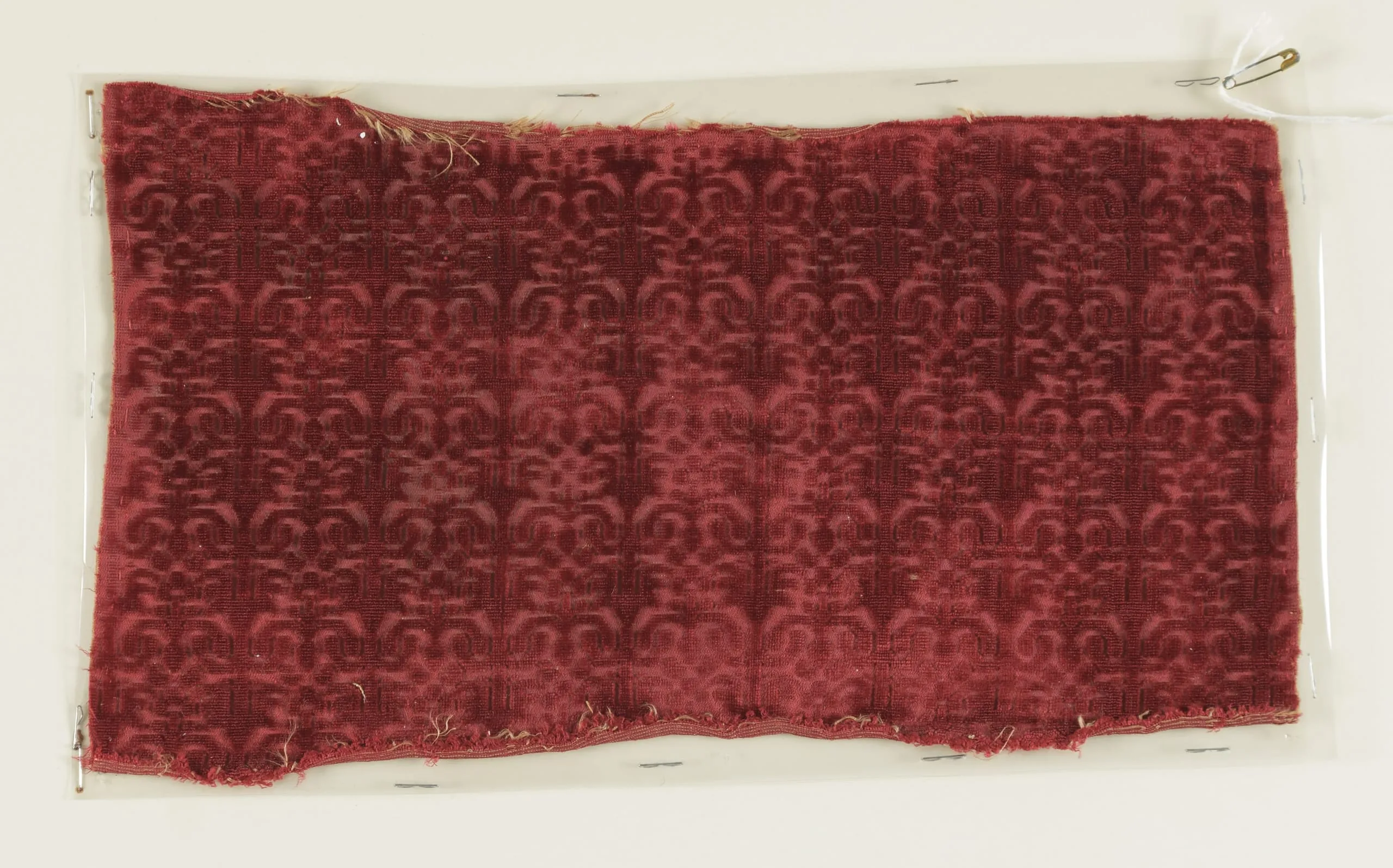 Horizontal fragment of crimson red voided velvet with an allover repeating pattern of stylized palmettes and interlocking scrolls in dark burgundy pile against a shinier ground, mounted on a clear backing with metal staples