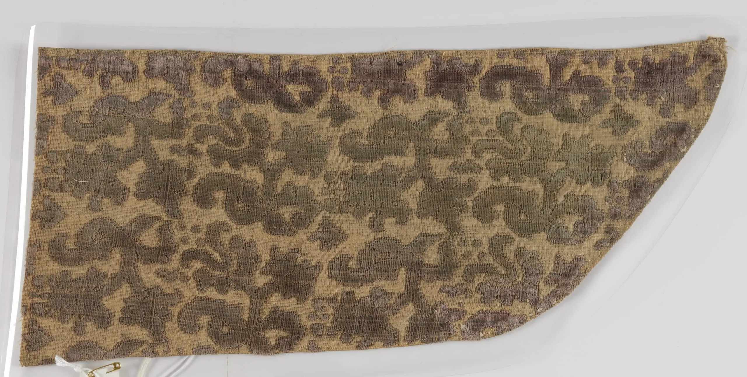 Textile fragment with a crescent shape, tan ground woven with dense allover scrolling motifs in olive brown and dusty mauve-gray, surface showing areas of wear