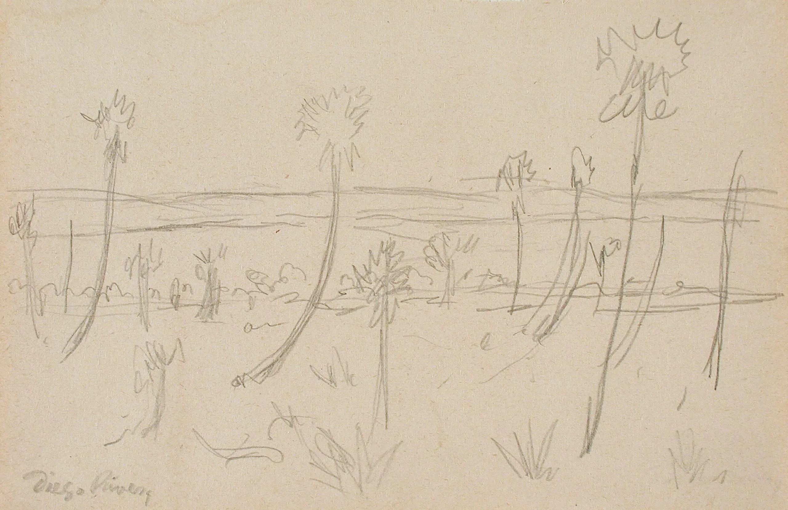 Pencil sketch on tan paper of a flat landscape with tall, slender palm trees, loose gestural lines, signed in cursive lower left