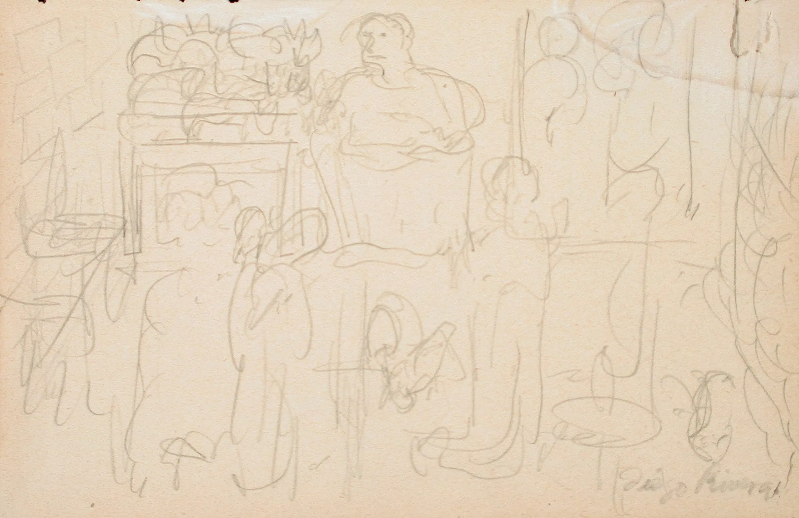 Loose graphite drawing on cream paper, sketching an interior scene with a large seated central figure surrounded by several smaller standing figures, furniture, and objects