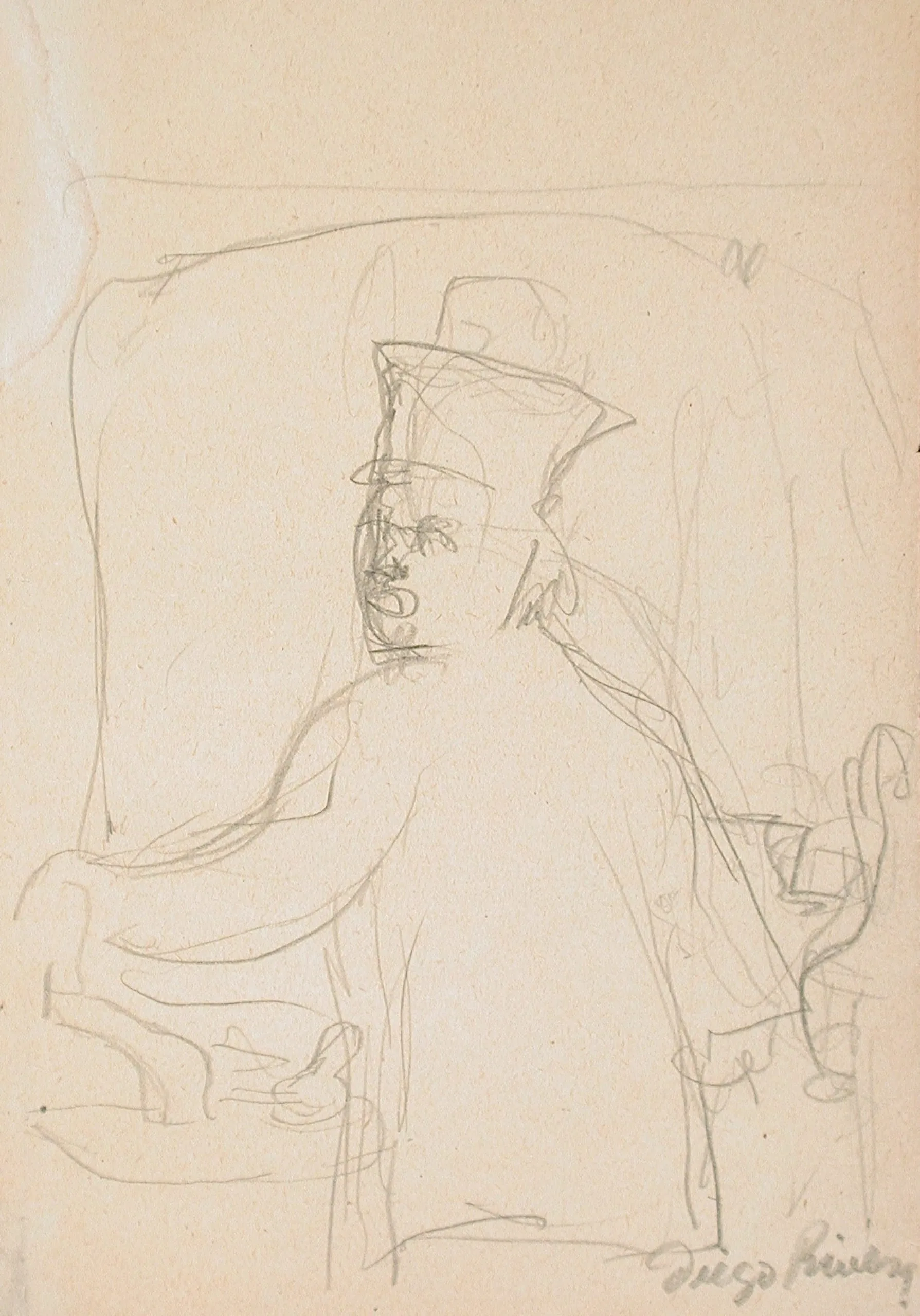 Graphite sketch on tan paper of a seated figure in profile wearing a wide-brimmed hat, rendered in loose, overlapping lines, signed in cursive lower right