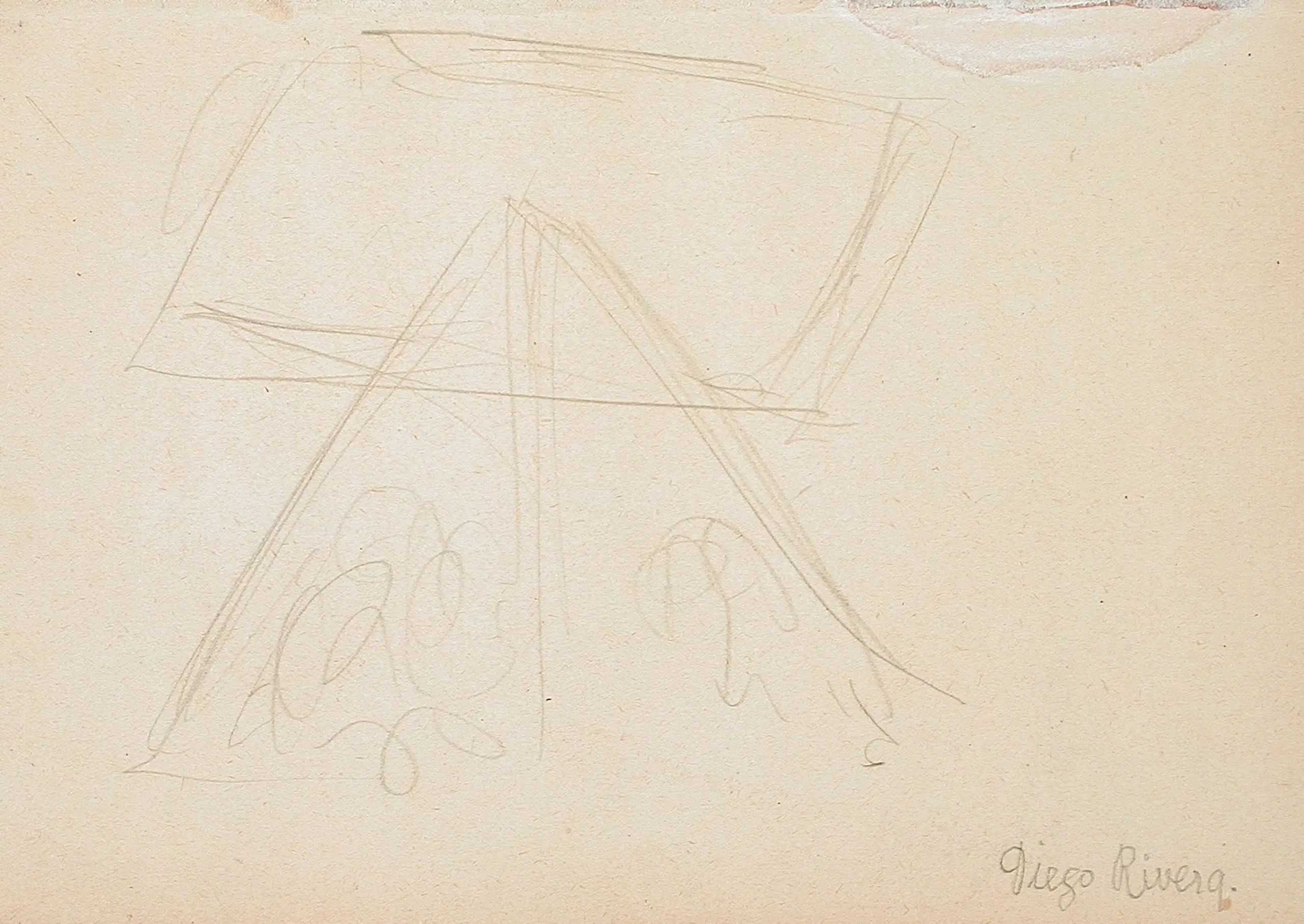Faint pencil drawing on cream paper with loosely sketched geometric lines and organic curling forms, signed 'Diego Rivera' in cursive at lower right