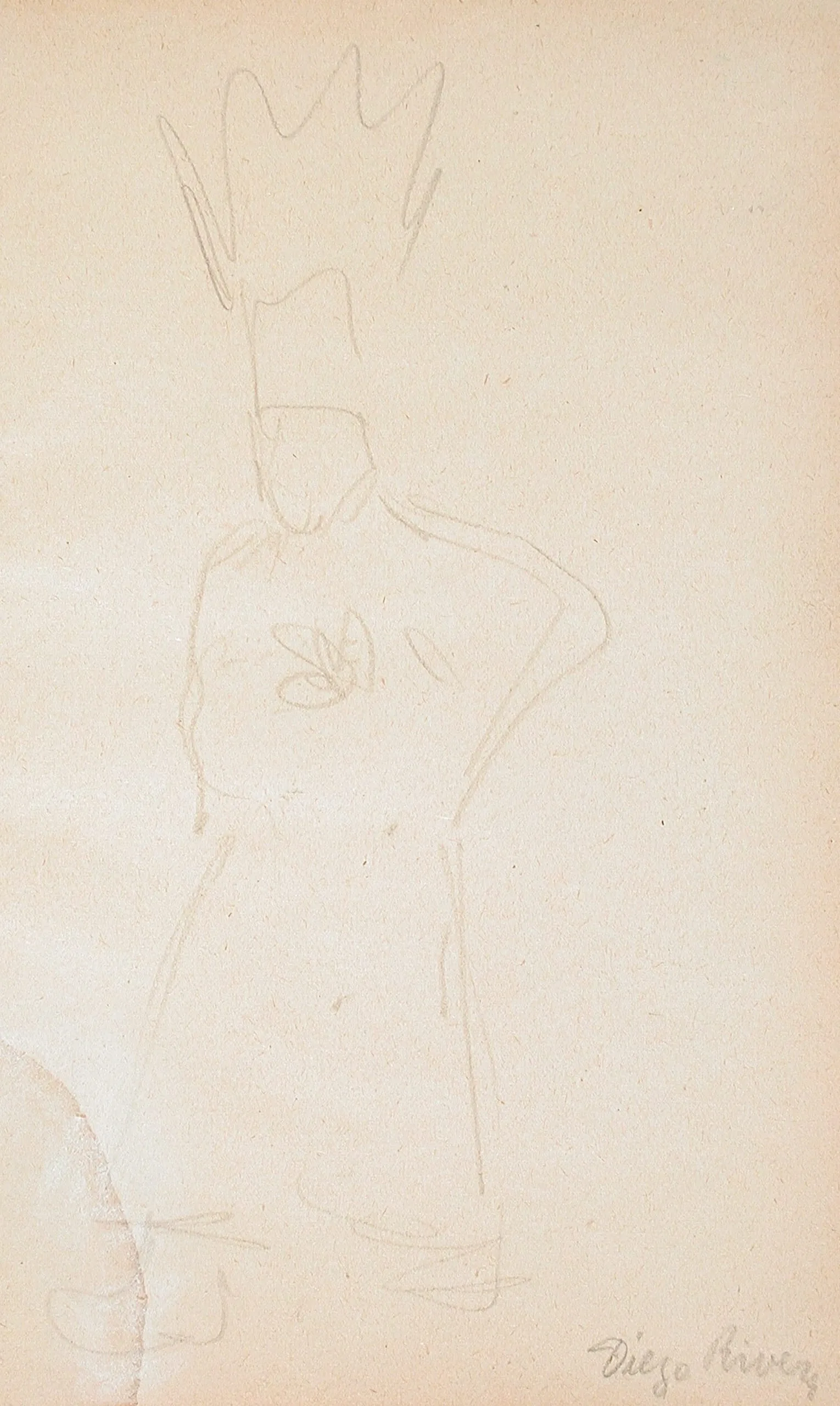 Faint pencil drawing on cream paper of a standing figure in a long garment with a tall pointed hat and crown shape above, with a cursive signature at lower right