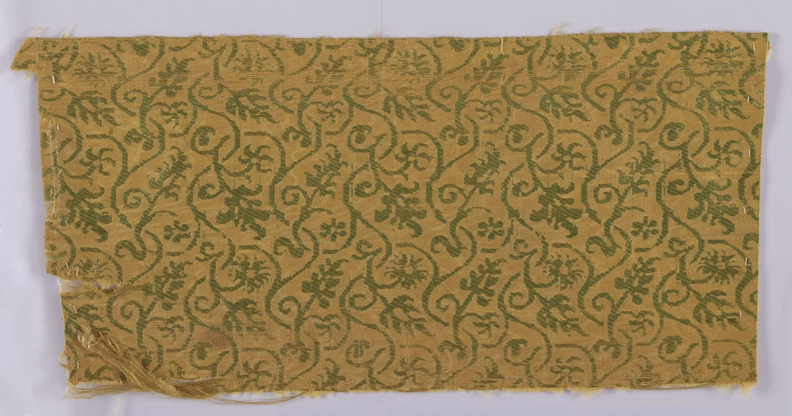Rectangular textile fragment with allover pattern of olive green scrolling vines, rosettes, and leaf clusters woven on a golden yellow ground, with frayed edges