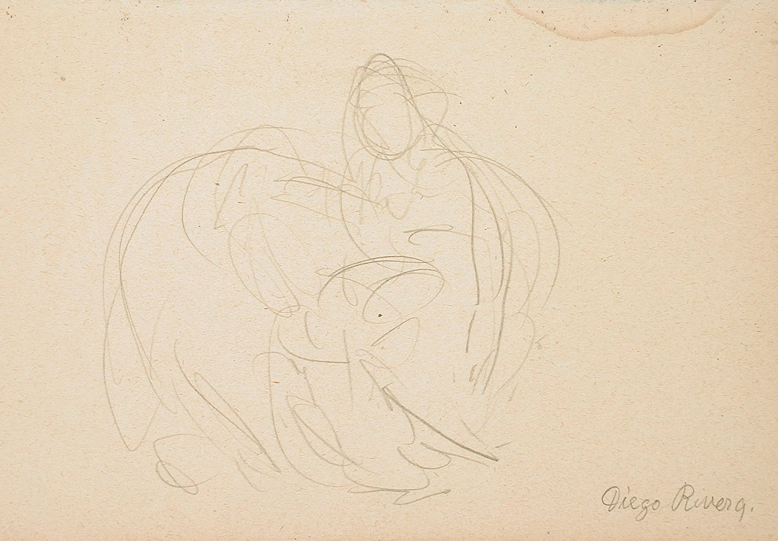 Gestural graphite drawing on cream paper, loose overlapping lines suggesting one or two human figures, signed "Diego Rivera" in cursive at lower right