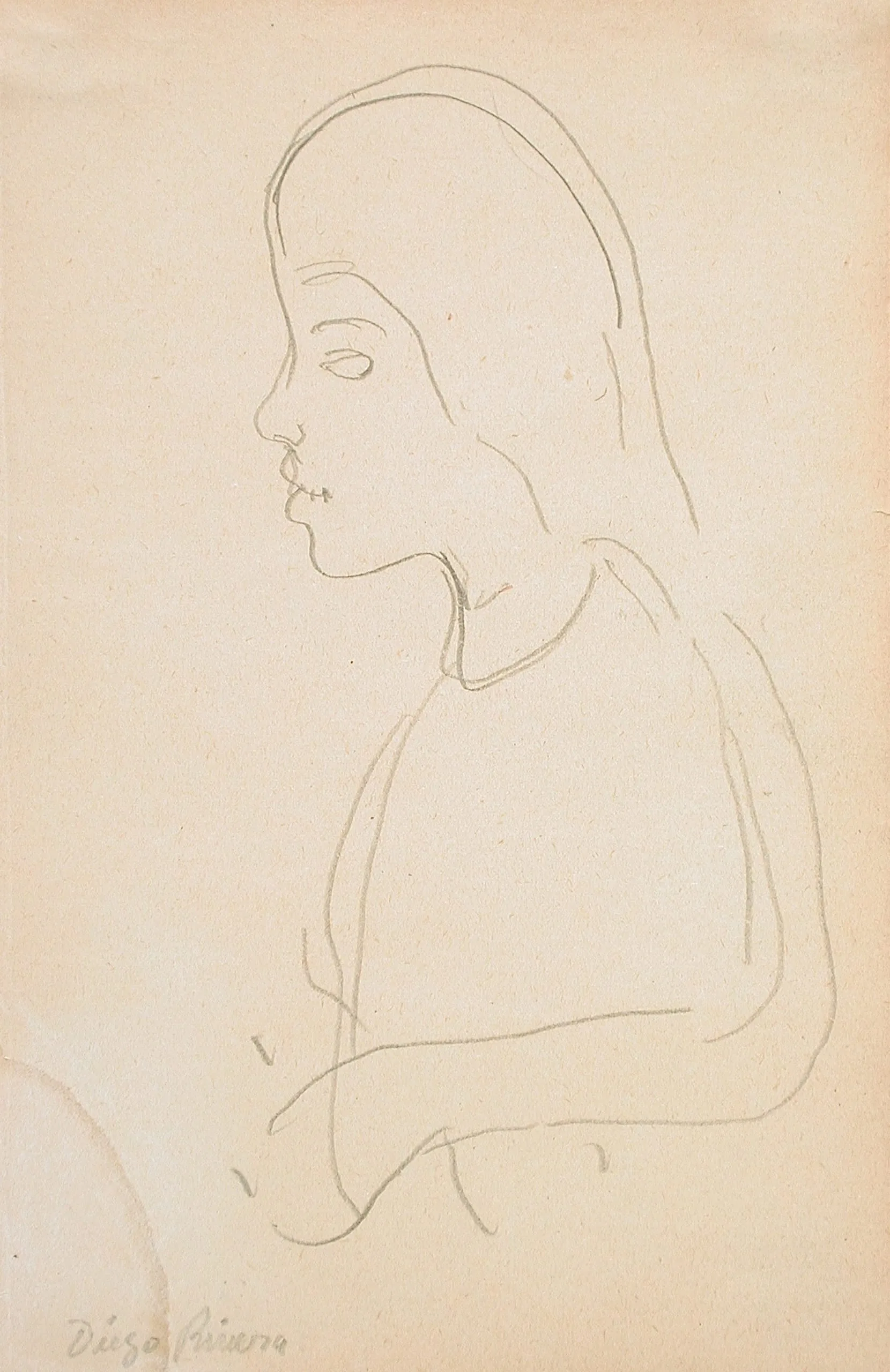 Pencil drawing on cream paper, bust-length profile of a woman with long straight hair and minimal contour lines, signed at lower left