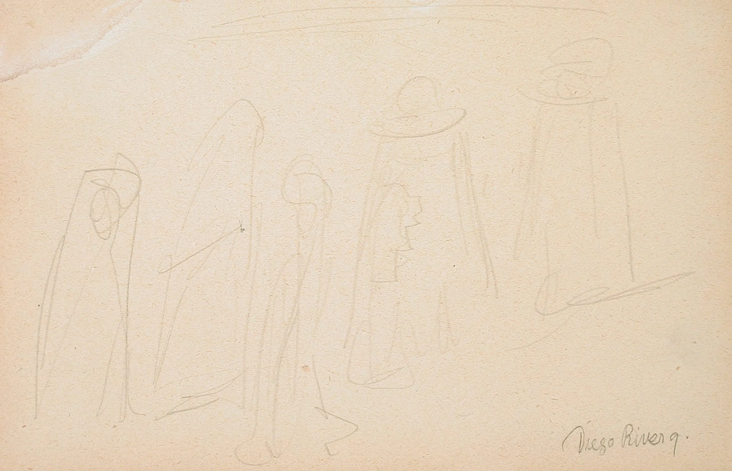 Faint graphite sketch on beige paper, five loosely drawn standing figures in long garments, signed "Diego Rivera" in cursive at lower right