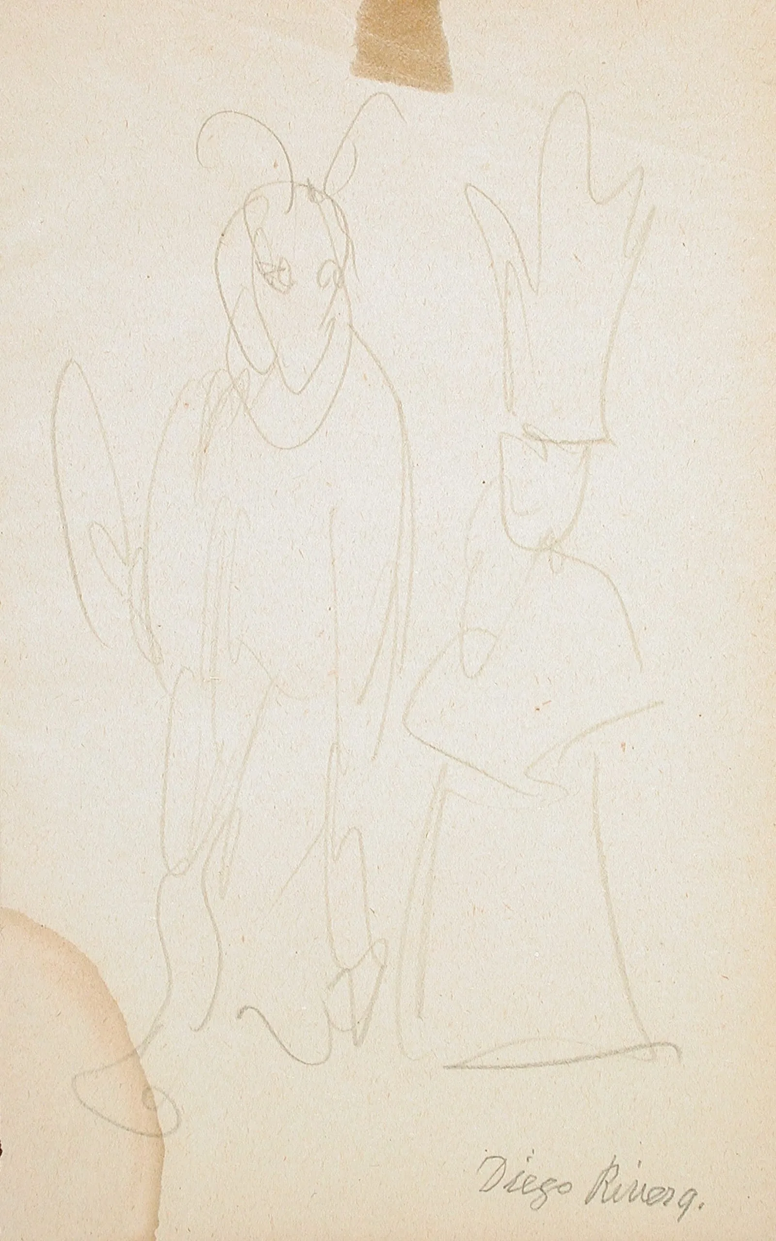 Faint graphite drawing on cream paper, two loosely sketched standing figures with gestural lines, signed "Diego Rivera." in cursive at lower right
