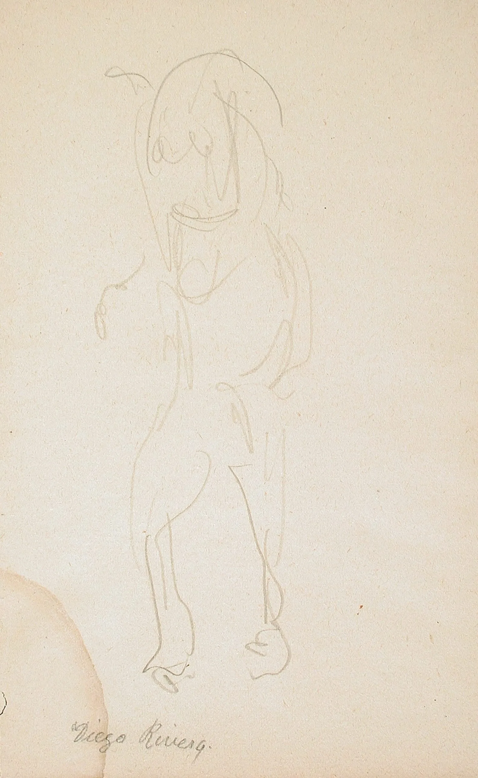 Pencil sketch on cream paper of a small standing figure with loose, gestural strokes, signed 'Diego Rivera' at the bottom