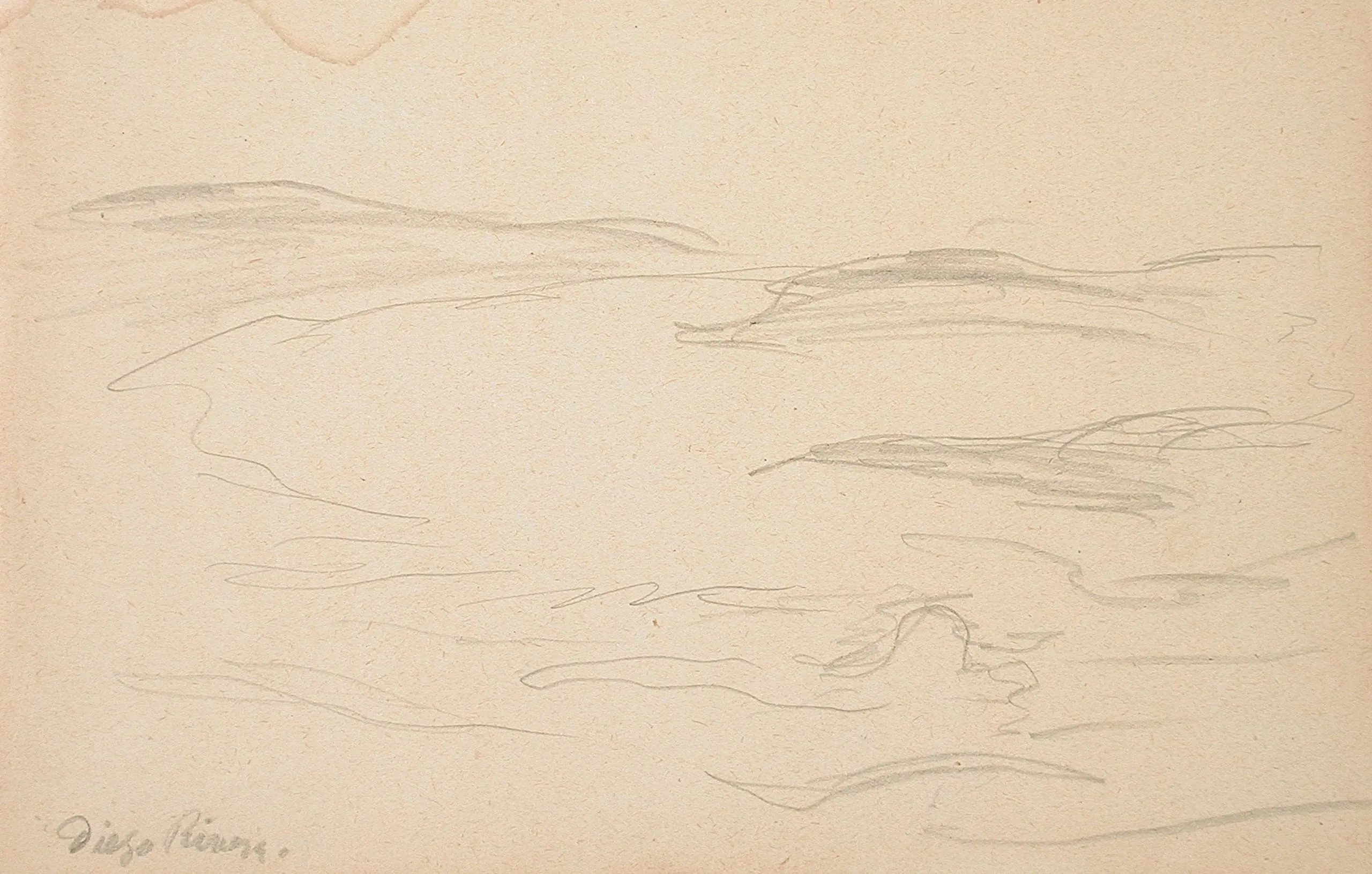 Pencil drawing on pale tan paper, loose gestural lines suggesting a wide landscape or water surface, with distant landforms, signed in cursive at lower left