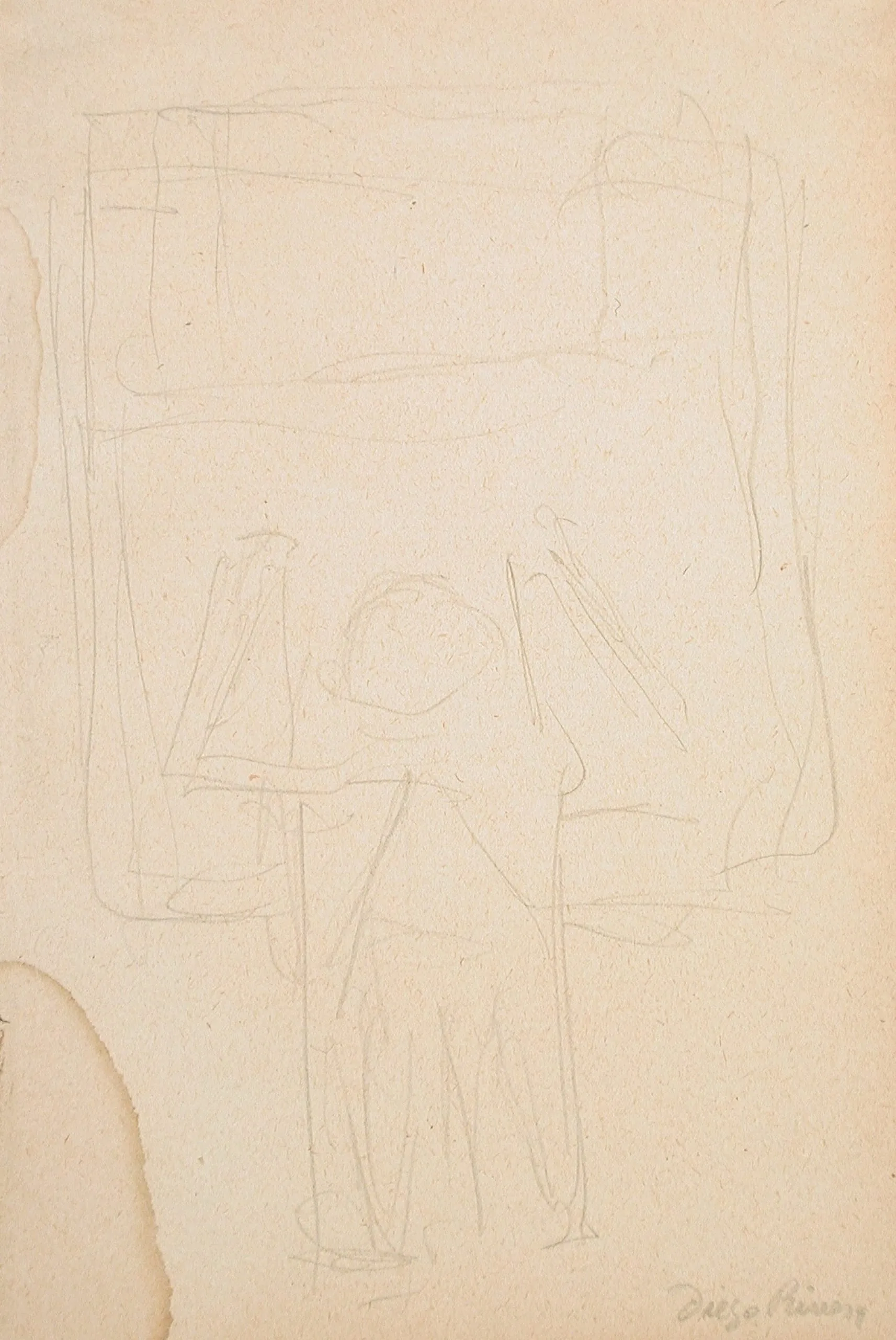 Faint graphite sketch on parchment-toned paper, loosely drawn standing figure before a large framed rectangle, with cursive signature at lower right