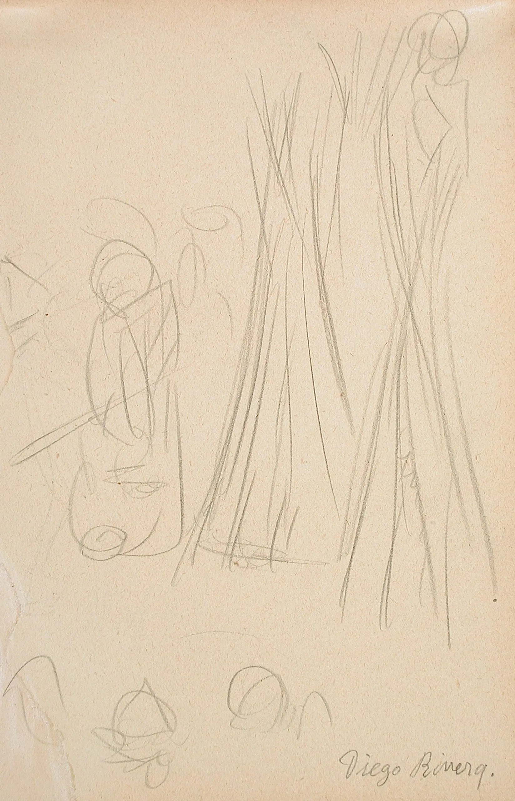 Pencil drawing on beige paper with loose gestural sketches of standing and seated figures, signed "Diego Rivera" in cursive at lower right