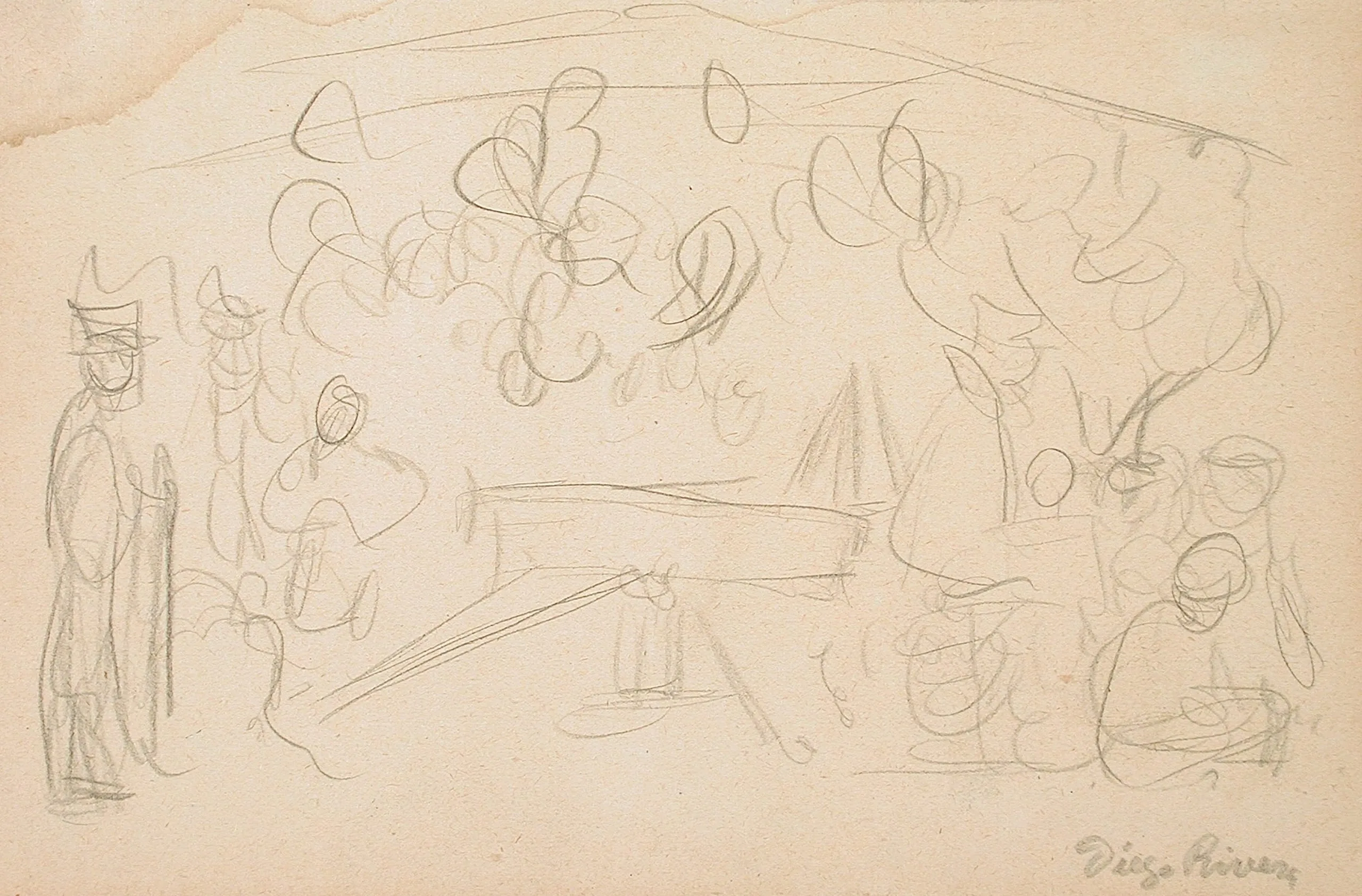 Gestural graphite pencil sketch on pale peach paper, outdoor scene with loosely drawn figures, foliage clusters, and diagonal lines suggesting a boat or reclining figure, signed "Diego Rivera" lower right