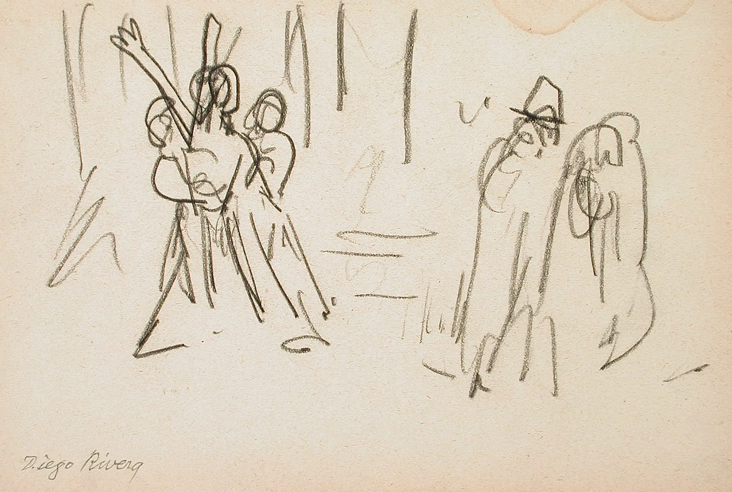 Gestural charcoal or graphite sketch on cream paper, two groups of loosely drawn figures on either side of a blank center, signed "Diego Rivera" in lower left