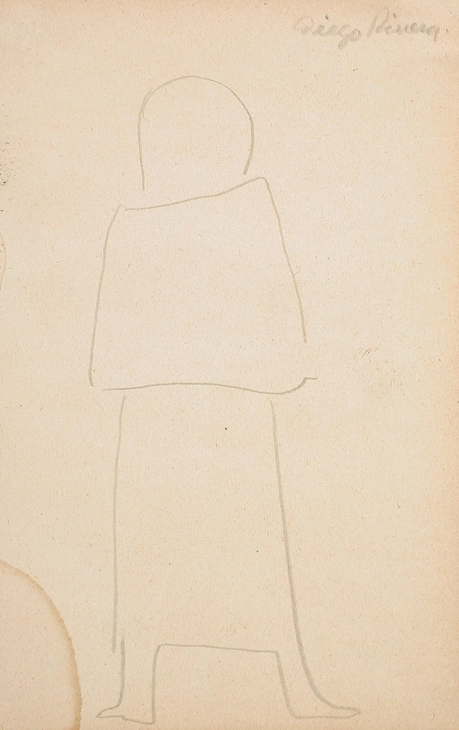 Graphite drawing on cream paper, faint outline of a standing cloaked figure with rounded head, minimal detail, inscription reading "Diego Rivera" in upper right