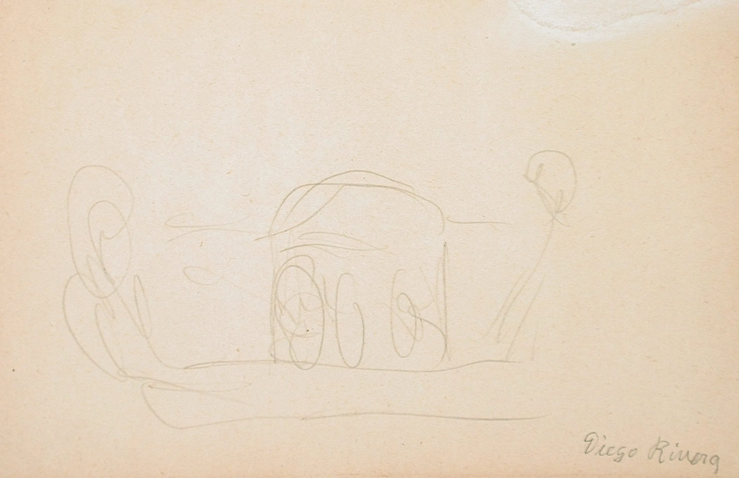 Loose graphite sketch on pale pink paper showing a wheeled vehicle with gestural figures, signed in cursive at lower right