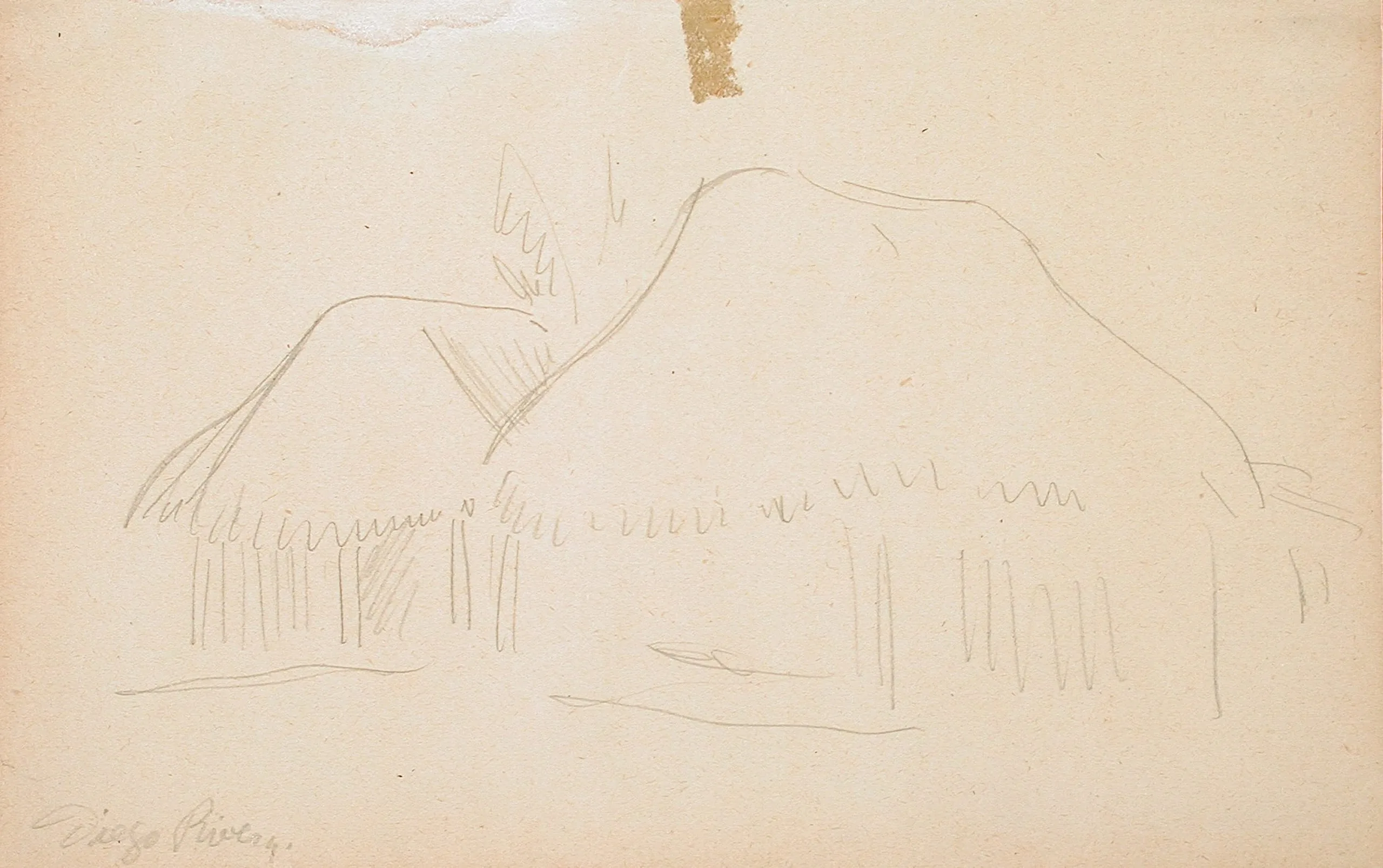 Pencil drawing on cream paper of two thatched-roof structures with loose, sketchy strokes, signed in cursive at lower left