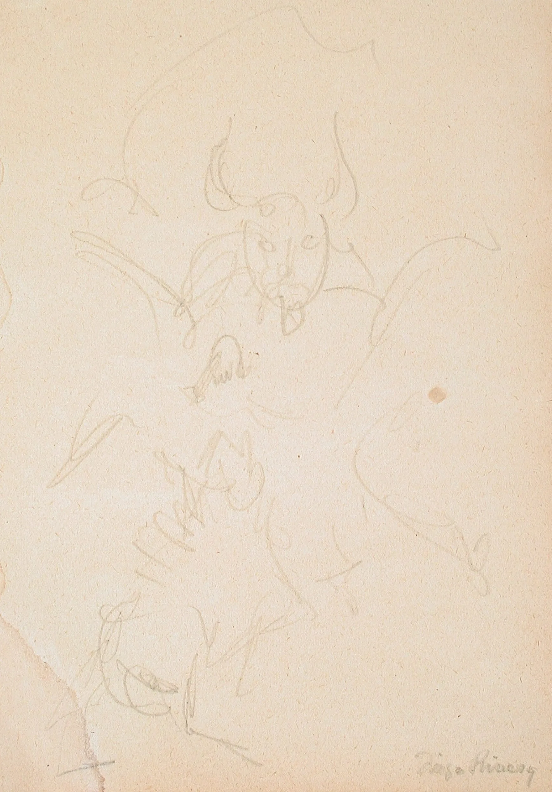 Faint pencil sketch on cream paper, loose gestural lines suggesting a horned figure or creature with possible wings or drapery, with a cursive signature at lower right