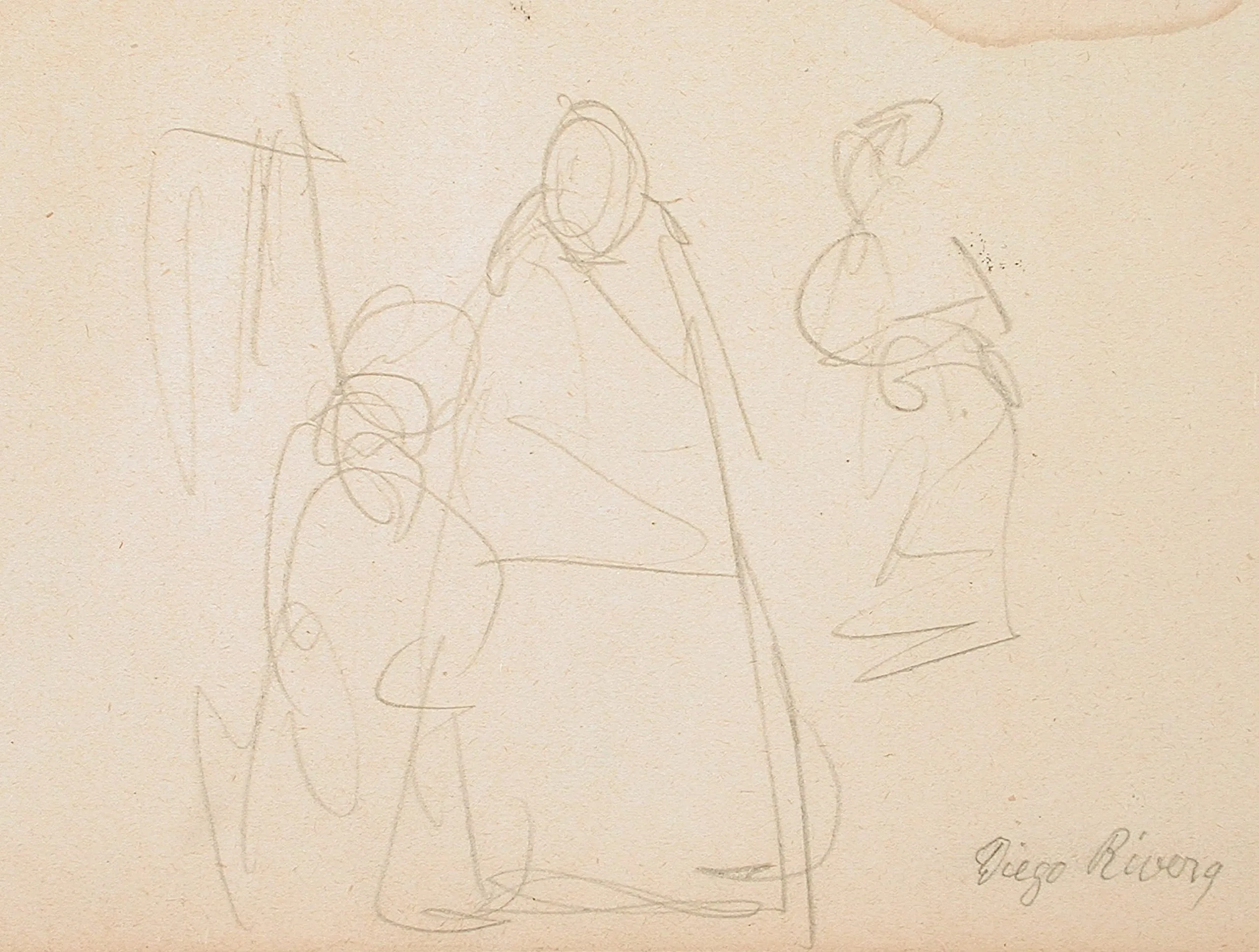 Graphite sketch on cream paper, three loosely drawn figures in wrapped garments, signed in cursive at lower right