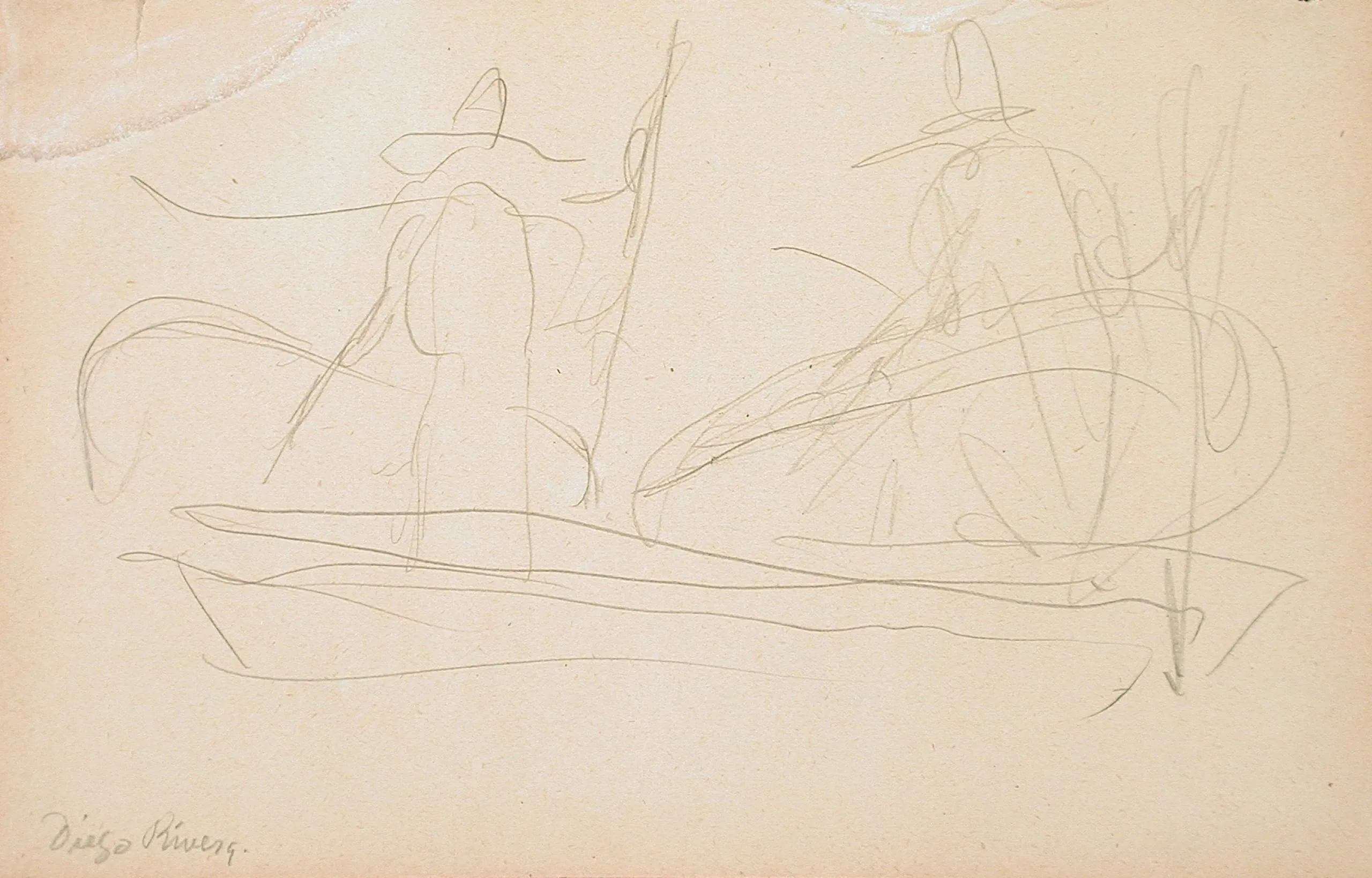 Pencil sketch on cream paper, two loosely drawn figures seated in a long narrow boat, with gestural, minimal linework