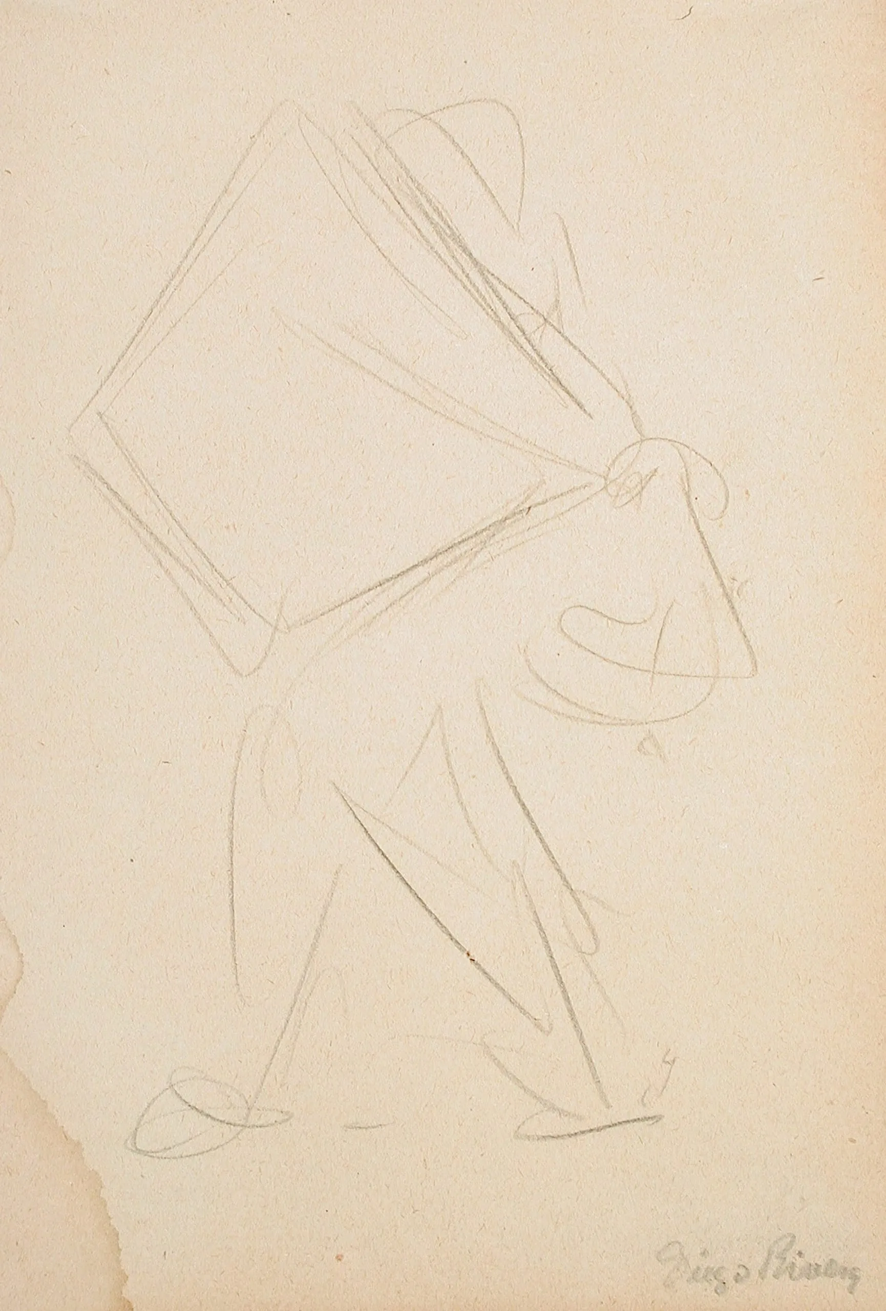 Gestural graphite sketch on cream paper of a figure bent forward under a large rectangular load, wearing a wide-brimmed hat, signed "Diego Rivera" in the lower right