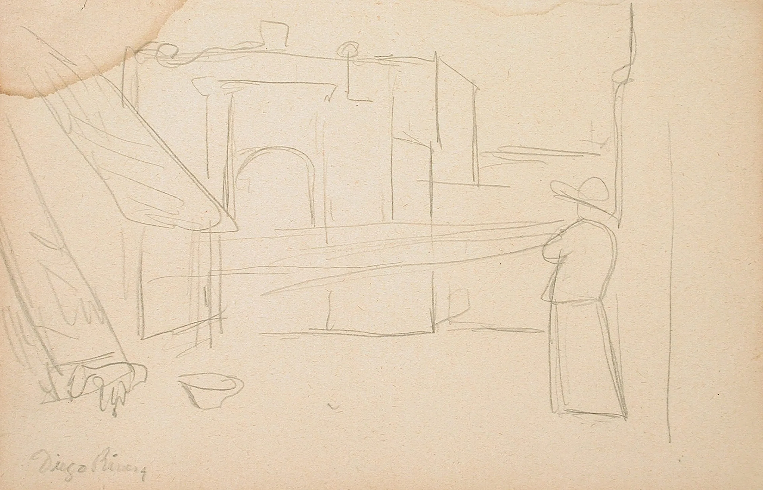 Graphite sketch on tan paper with loose lines depicting a cloaked figure in a wide-brimmed hat, blocky architectural forms, and scattered objects, signed "Diego Rivera"