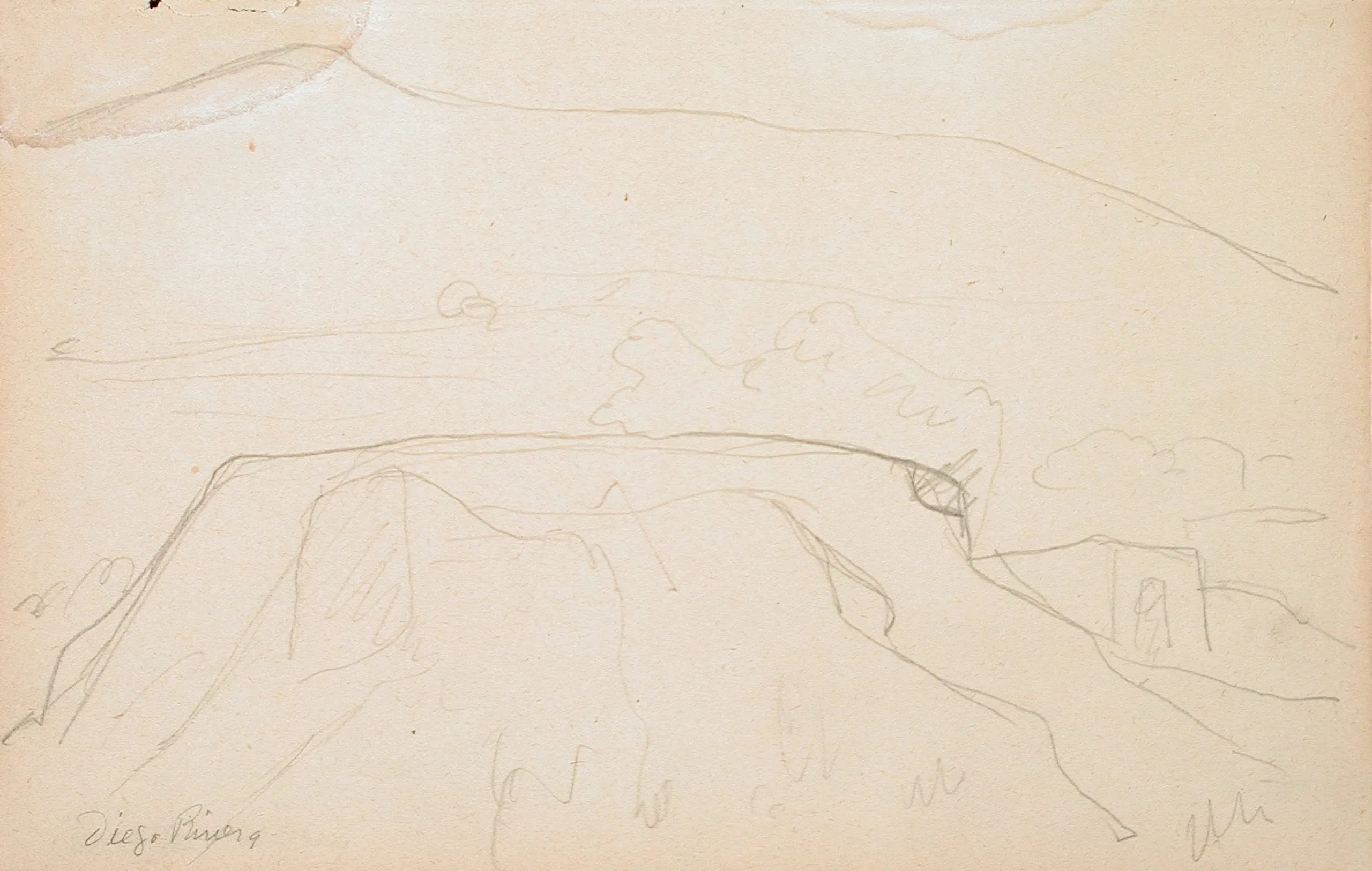 Pencil landscape drawing on cream paper with faint, sketchy lines depicting flat-topped mesas and distant ridgelines, signed 'Diego Rivera' at lower left