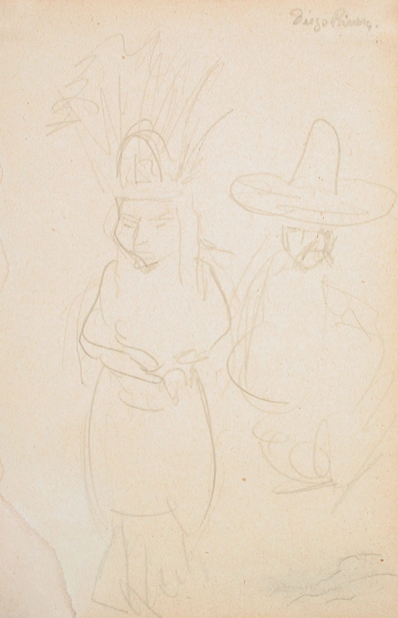 Pencil drawing on cream paper, two loosely sketched standing figures, one with a feathered headdress and one with a wide-brimmed hat, inscribed "Diego Rivera" upper right