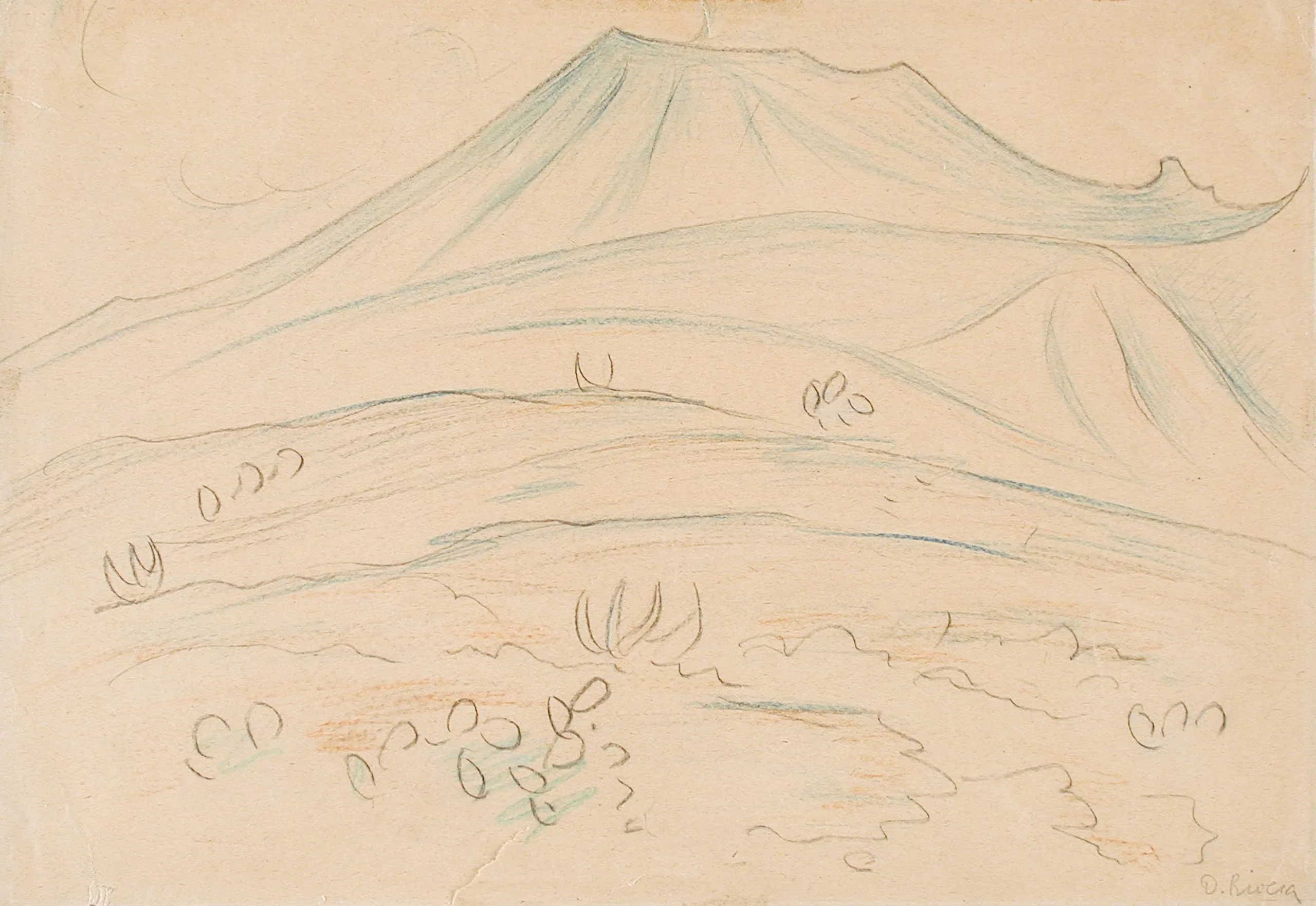 Landscape drawing in soft colored pencil on cream paper, showing a cone-shaped mountain, rolling hills, and scattered desert shrubs rendered in pale blue, green, and orange