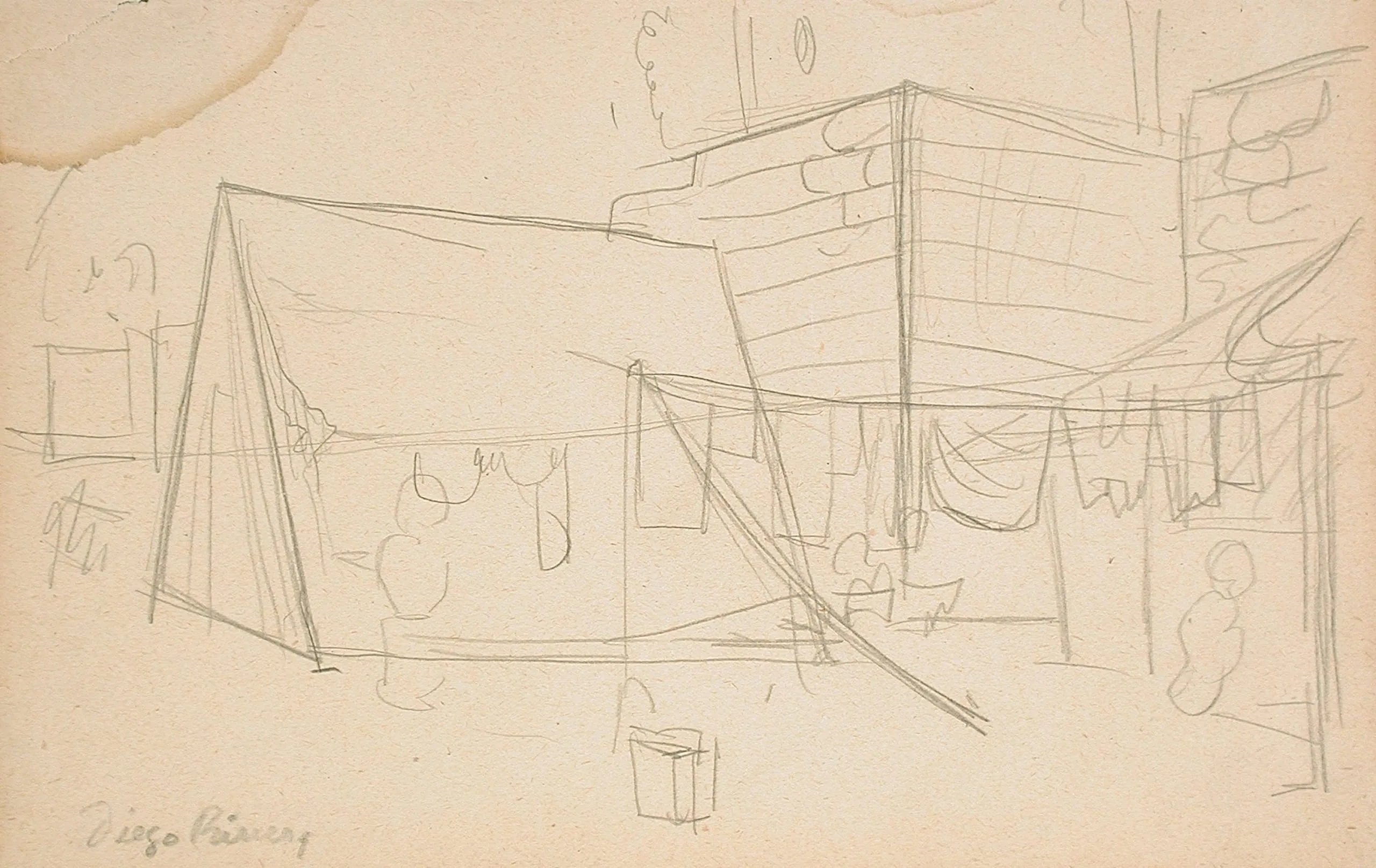 Pencil drawing on tan paper, loose sketch of a tent encampment with hanging vessels, rope lines, and rectangular structures