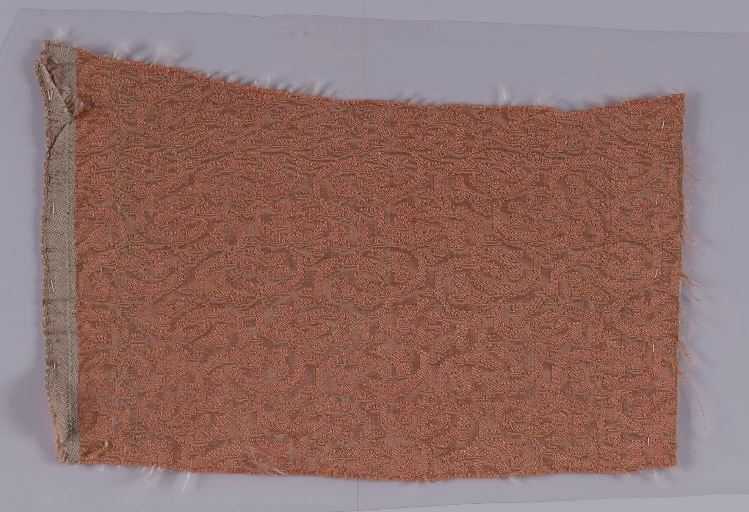 Horizontal textile fragment in salmon-red with an allover self-patterned woven scrollwork design; frayed left edge reveals tan selvedge