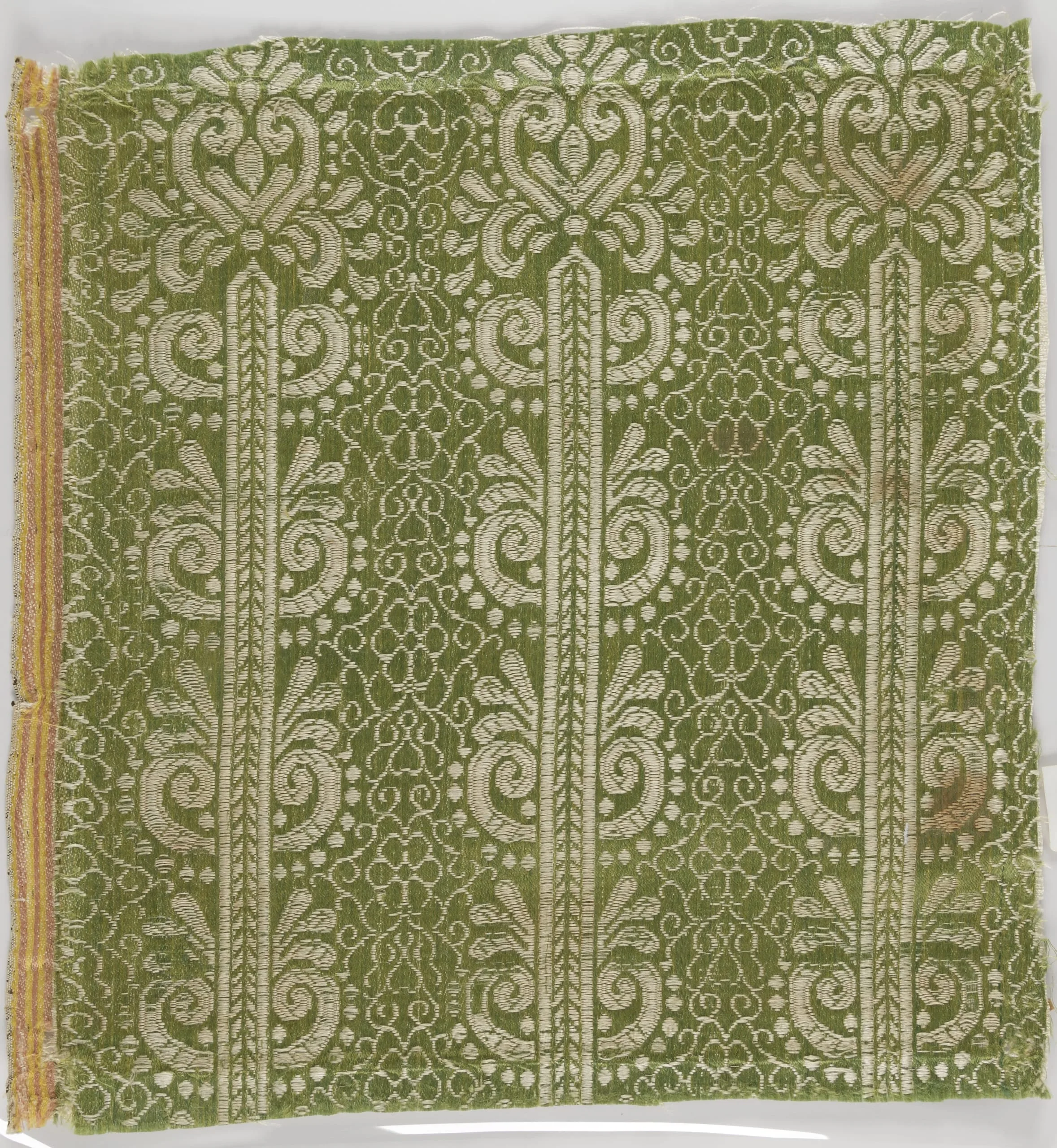 Woven silk textile fragment in sage and olive green with a cream-colored pattern of symmetrical scrolling volutes, acanthus leaves, bow-knot motifs, and vertical stripes against a dense allover filler ground