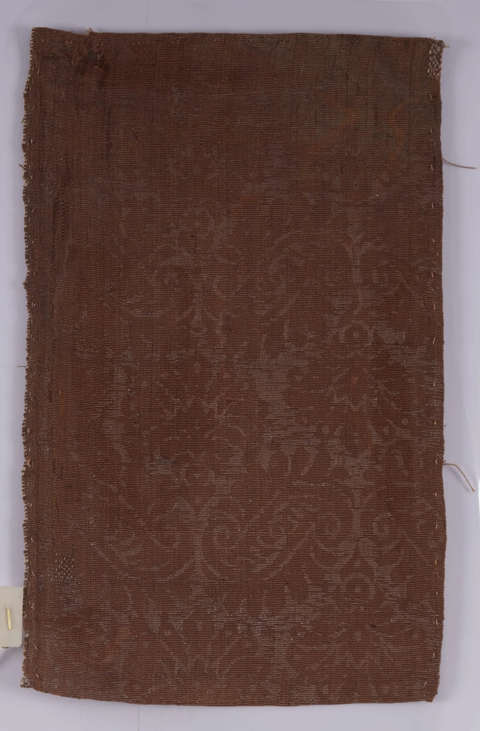 Vertical textile fragment in chestnut brown damask weave with an allover repeating pattern of scrolling vines, acanthus leaves, and palmette forms, unfinished edges with loose threads