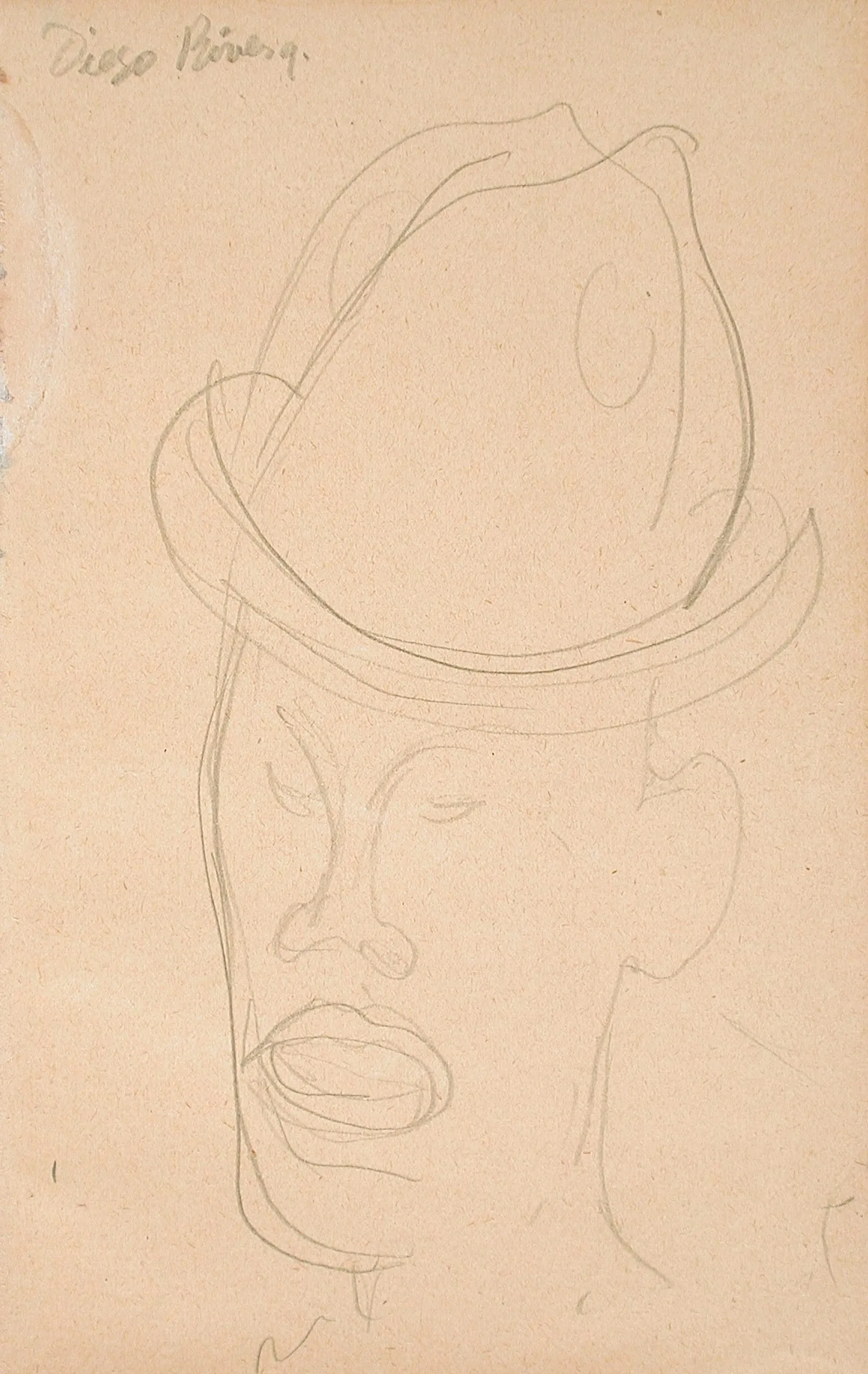 Pencil drawing on tan paper, loosely sketched head-and-shoulders portrait of a figure wearing a wide-brimmed soft hat, with gestural lines and minimal detail