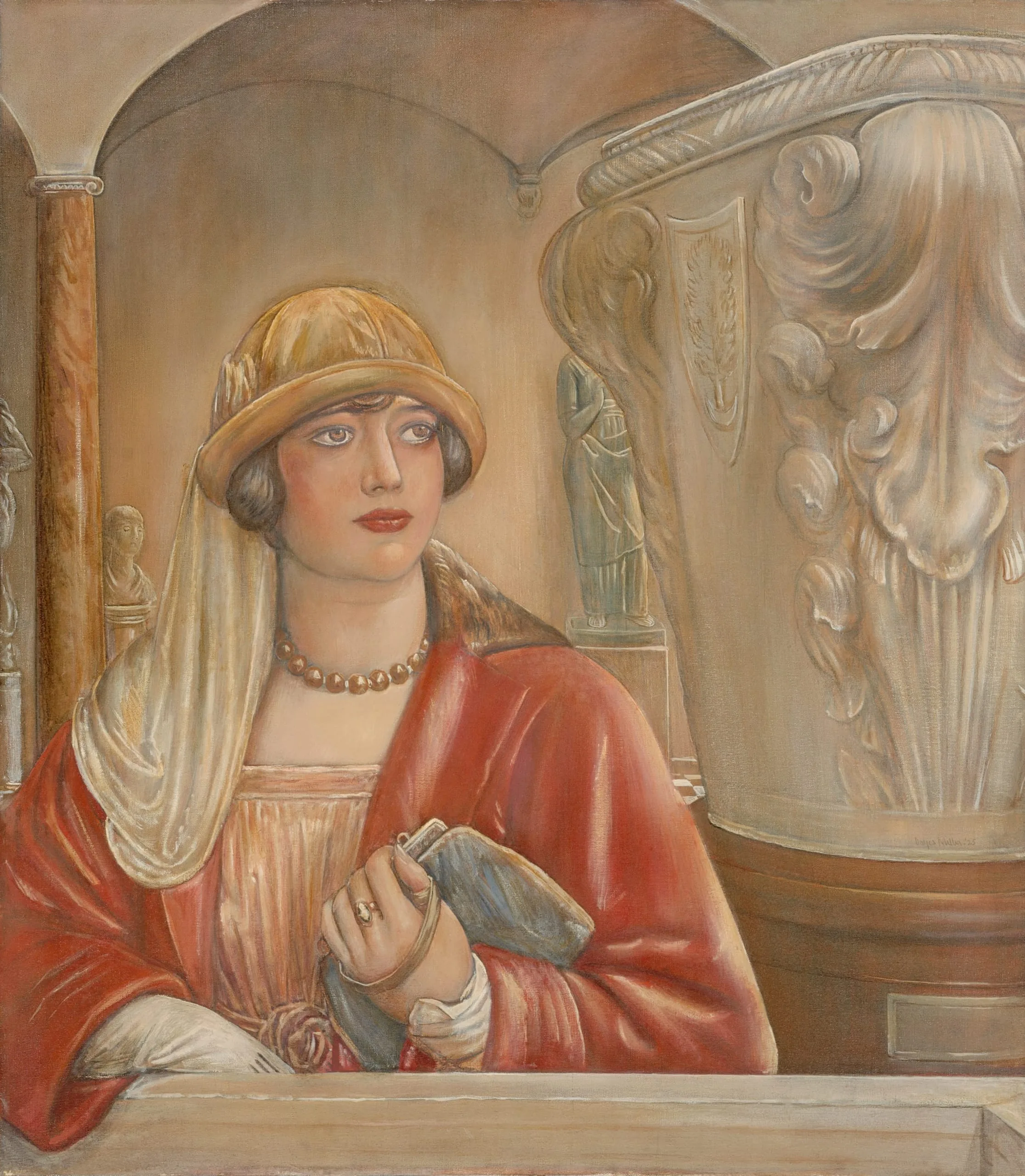 Woman in Sculpture Hall summarizes Miller’s mature art for it demonstrates two of his obsessions: modern woman and antique sculpture. Greenbaum is presented as a typical Miller woman, somewhat chubby, with a round face, large eyes, and full lips, wearing the usual "shopper" attire -- a fashionable overcoat, beaded necklace, and cloche -- with handbag at her side. The museum setting may have been chosen as a vehicle for Miller to express more openly his respect for classical art. Once Miller adopted the shopper image, he rarely referred to antique motifs, even in his nudes. Instead, he conceived his women as sculpture, painting them fully modeled and like stone works of art. The artist described this painting’s masses as "falling in two columns." Miller also seems to have purposely limited his palette to dull beiges and oranges, alluding to the color of stone. With such a color scheme he was able to present his two interests in a single, unified image.
