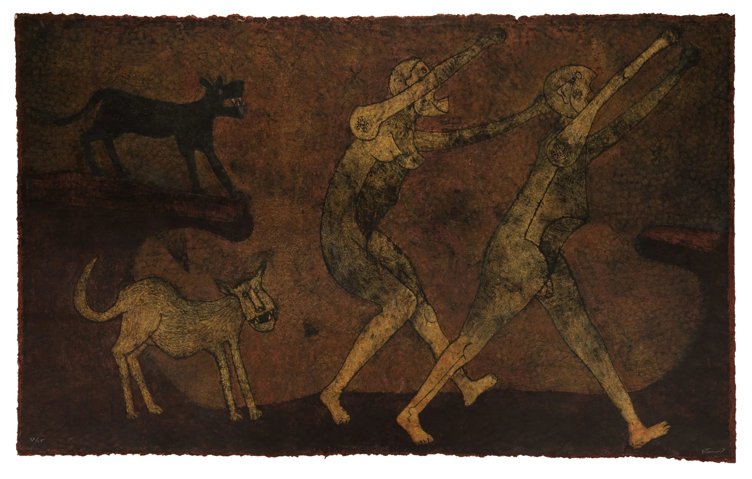 Two Personages Attacked by Dogs is Tamayo’s manifestation of this idea and a product of three years of work. The print measures just over five feet tall by eight feet wide; and represents as much an engineering feat as an artistic one. Completed in an edition of seventy-five, Two Personages Attacked by Dogs fulfilled Tamayo’s vision of disseminating a work of immense scale.