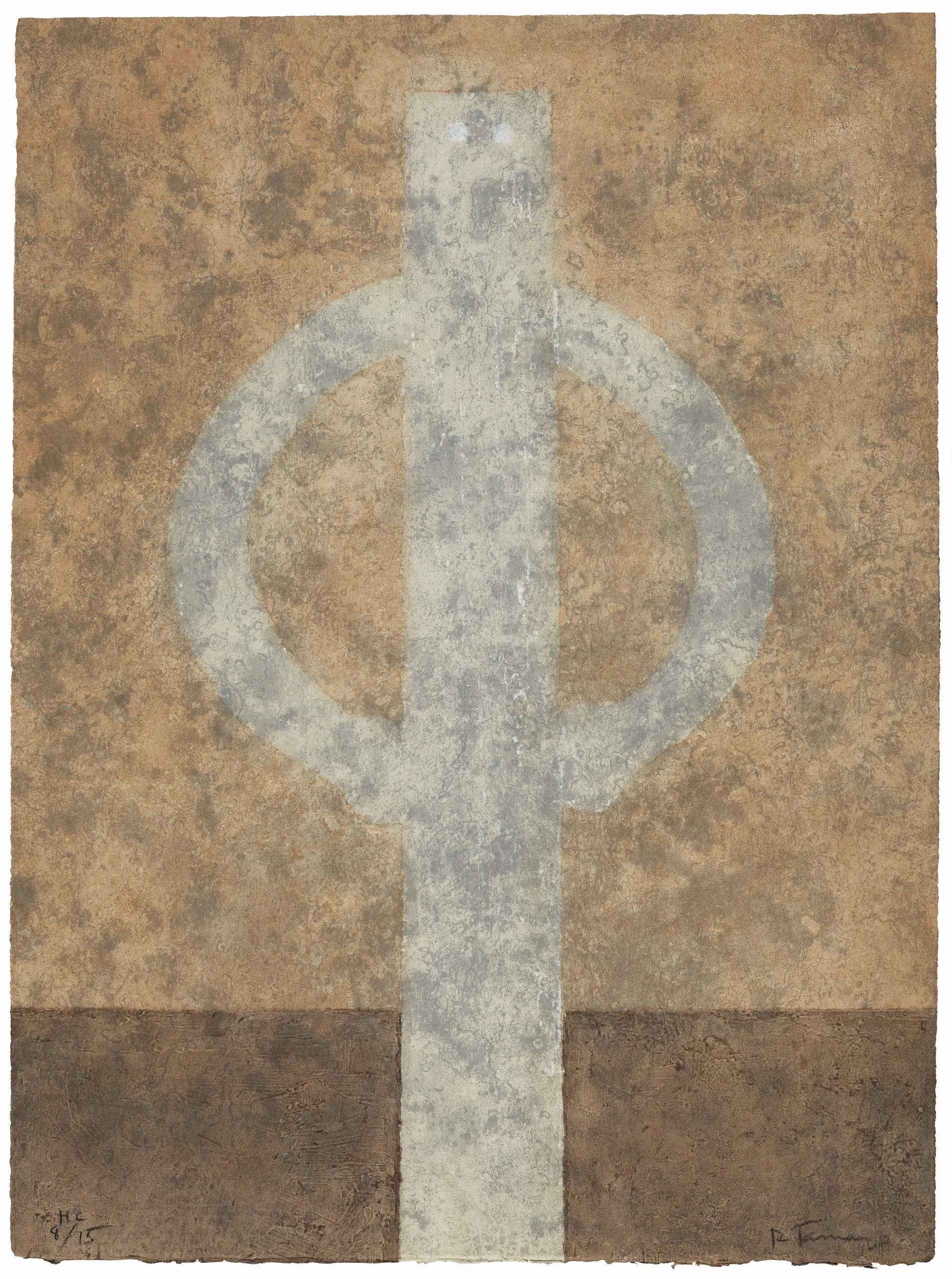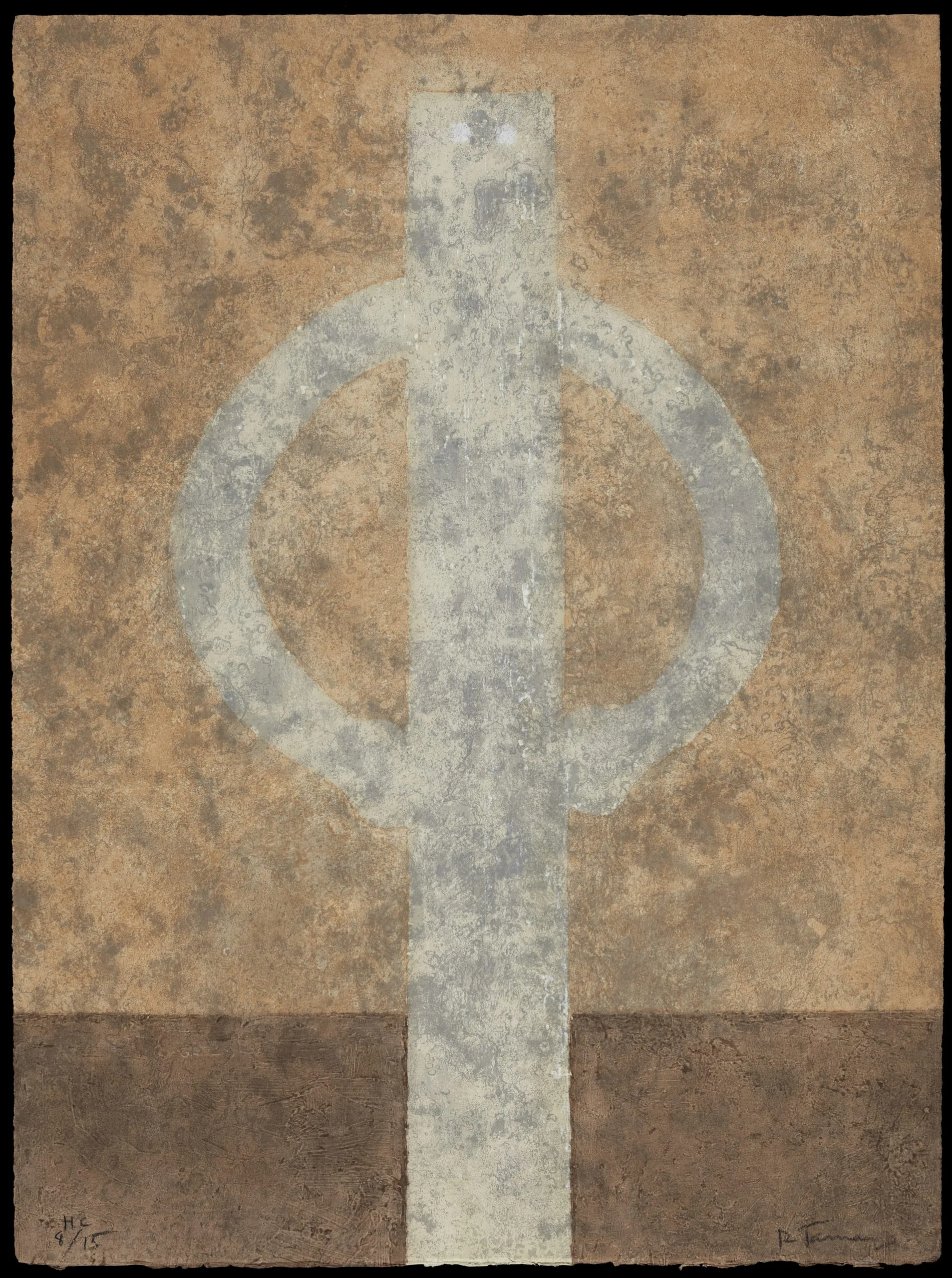 In Figure with Arms Akimbo, Rufino Tamayo distills the human form into its most basic shapes. From the head down to the legs, a single thin rectangle represents the full length of the body. Two small light circles at the top of the rectangle create eyes, the only nod to facial features or detail. An open circle forms the curve of the arms, with slightly rounded ends to differentiate the hands placed on the figure’s hips. Among the most reduced figures that emerge in Tamayo’s work, this came to function as a sign representing a man, and subsequently appeared in prints, paintings, and even sculpture, a less common aspect of Tamayo’s production.