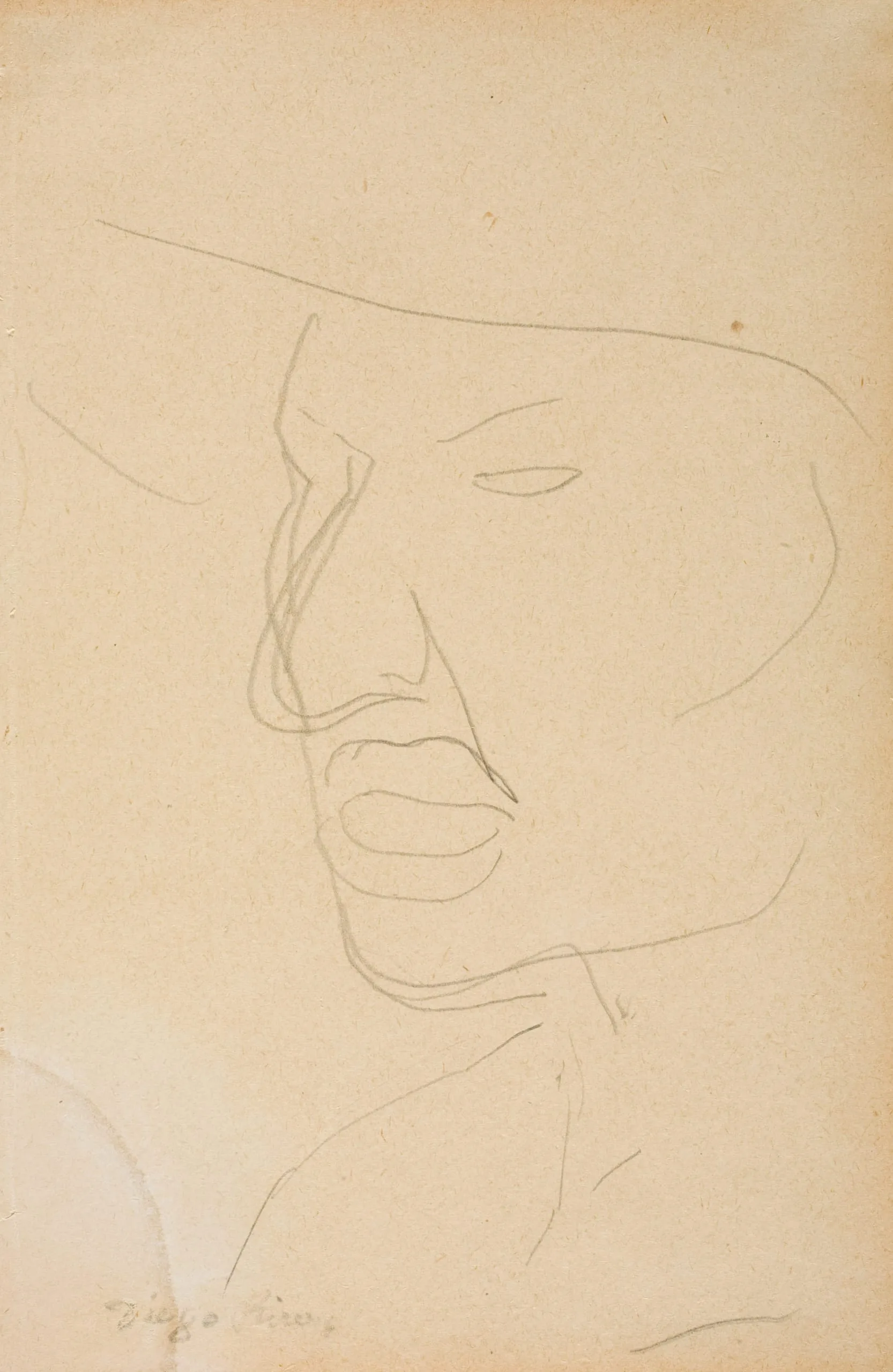 Graphite sketch on tan paper of a downward-tilting face wearing a wide-brimmed hat, drawn with spare, fluid lines; inscribed 'Diego Rivera' at lower left