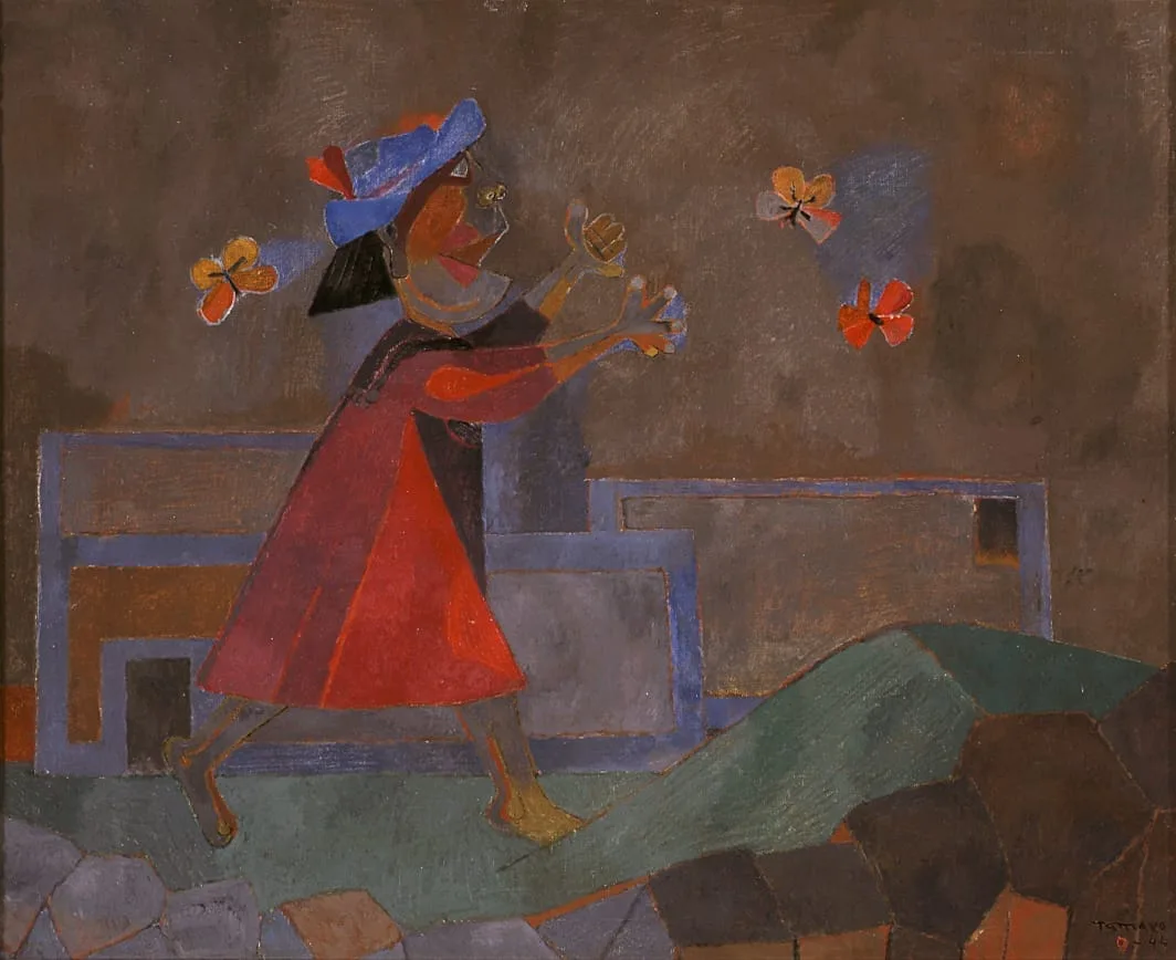 In Butterfly Hunter, Tamayo plays with geometric shapes to develop the form of his figure and her surroundings. The girl, wearing a dress composed of a triangular prism, runs after the butterflies amid a landscape of angular rocks and stacked rectangles suggesting a group of nearby buildings. The girl reaching out to catch the fluttering creatures introduces movement into the scene, which works with the painting’s colors and shapes to engender a sense of vibrant dynamism—an increasing concern for Tamayo during this period.