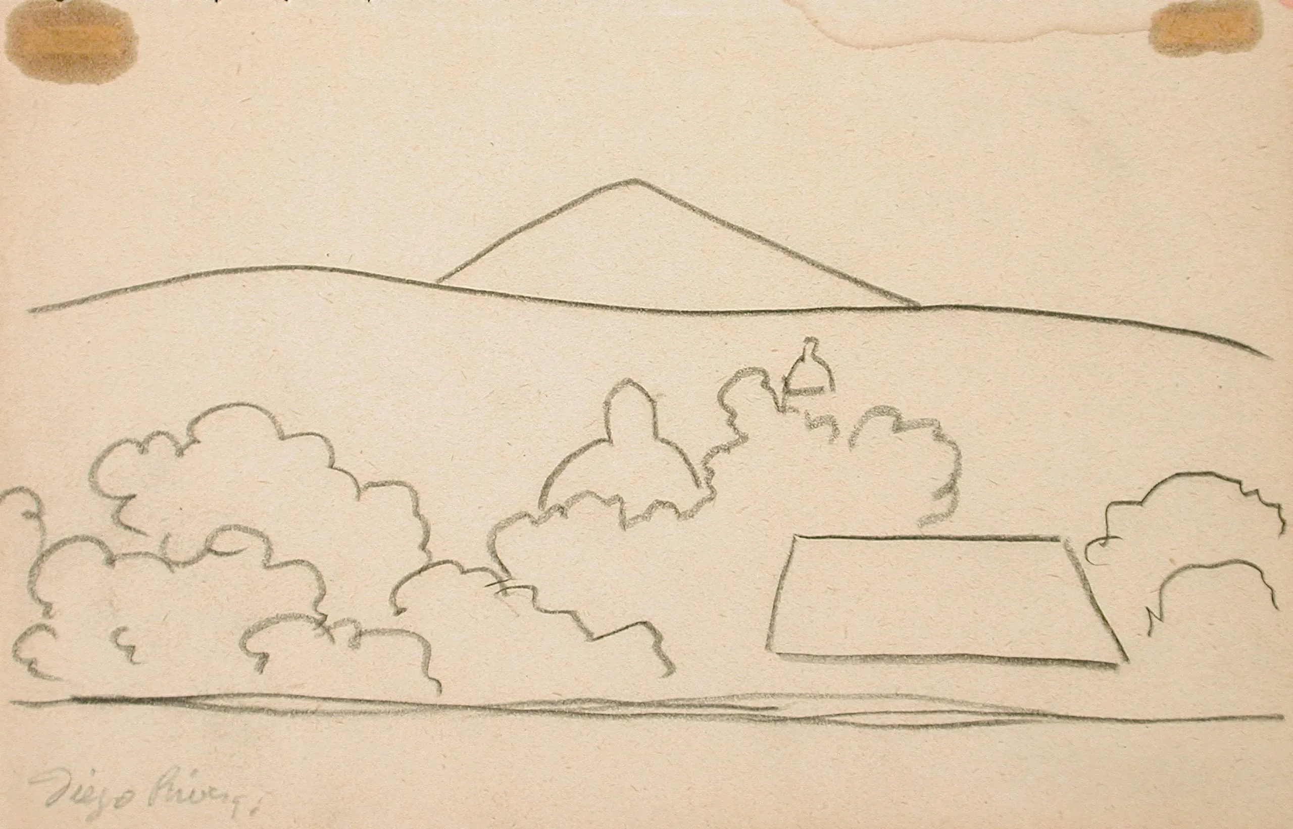 Pencil drawing on cream paper of a simplified landscape with rounded trees, a triangular mountain peak, a small domed structure, and a flat-roofed building, signed in cursive at lower left