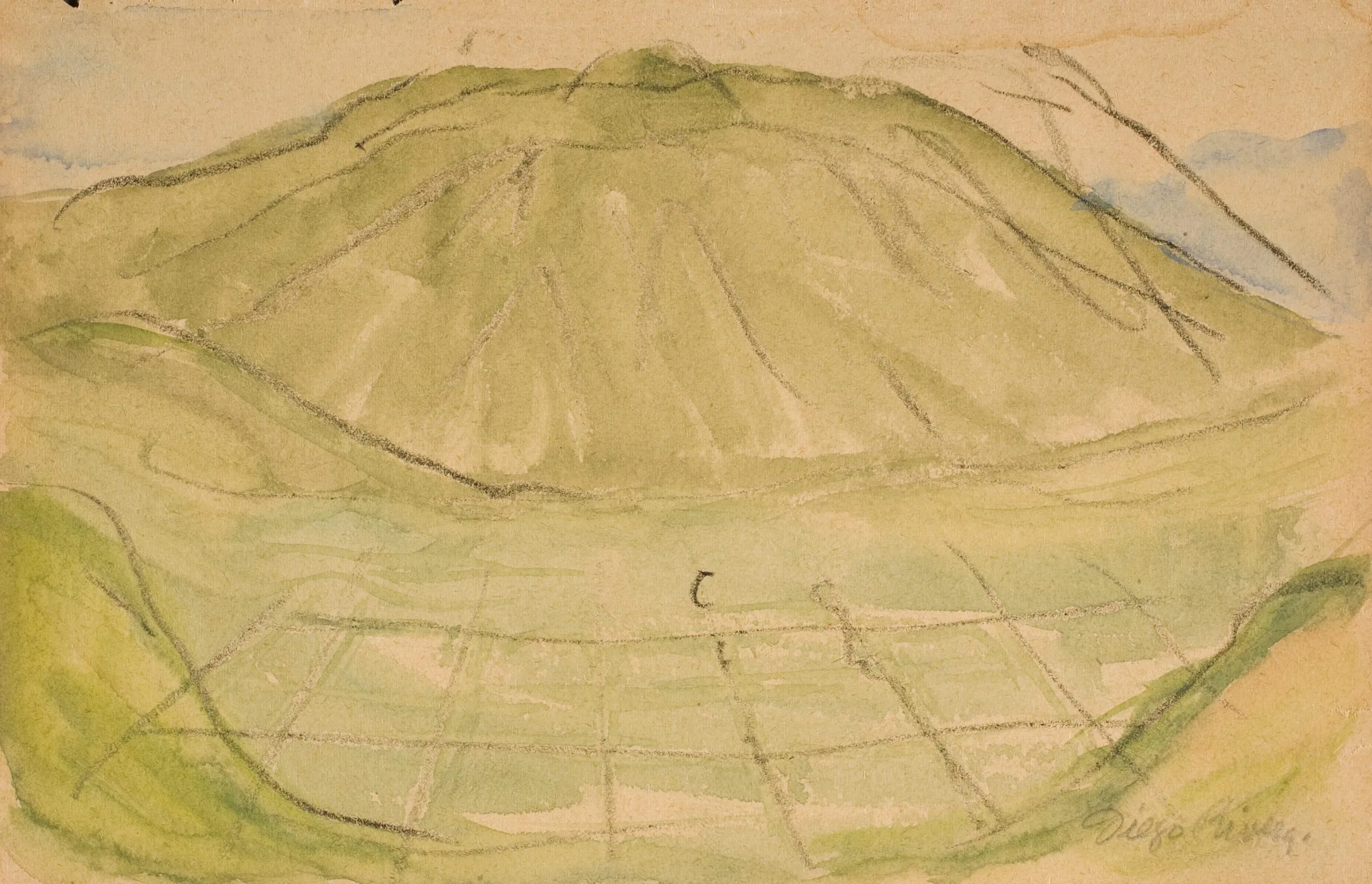 Pencil and watercolor drawing of a broad, rounded mountain in olive and yellow-green tones above a flat, grid-lined plain, signed in cursive at lower right