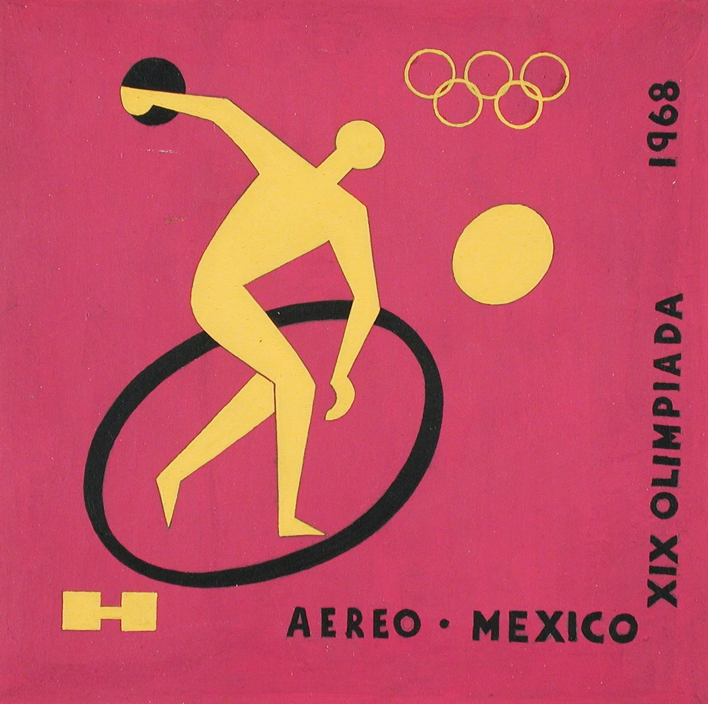 Graphic print in magenta, yellow, and black depicting a stylized discus thrower encircled by a black ring, with Olympic rings and text reading 'XIX OLIMPIADA 1968' and 'AEREO • MEXICO'