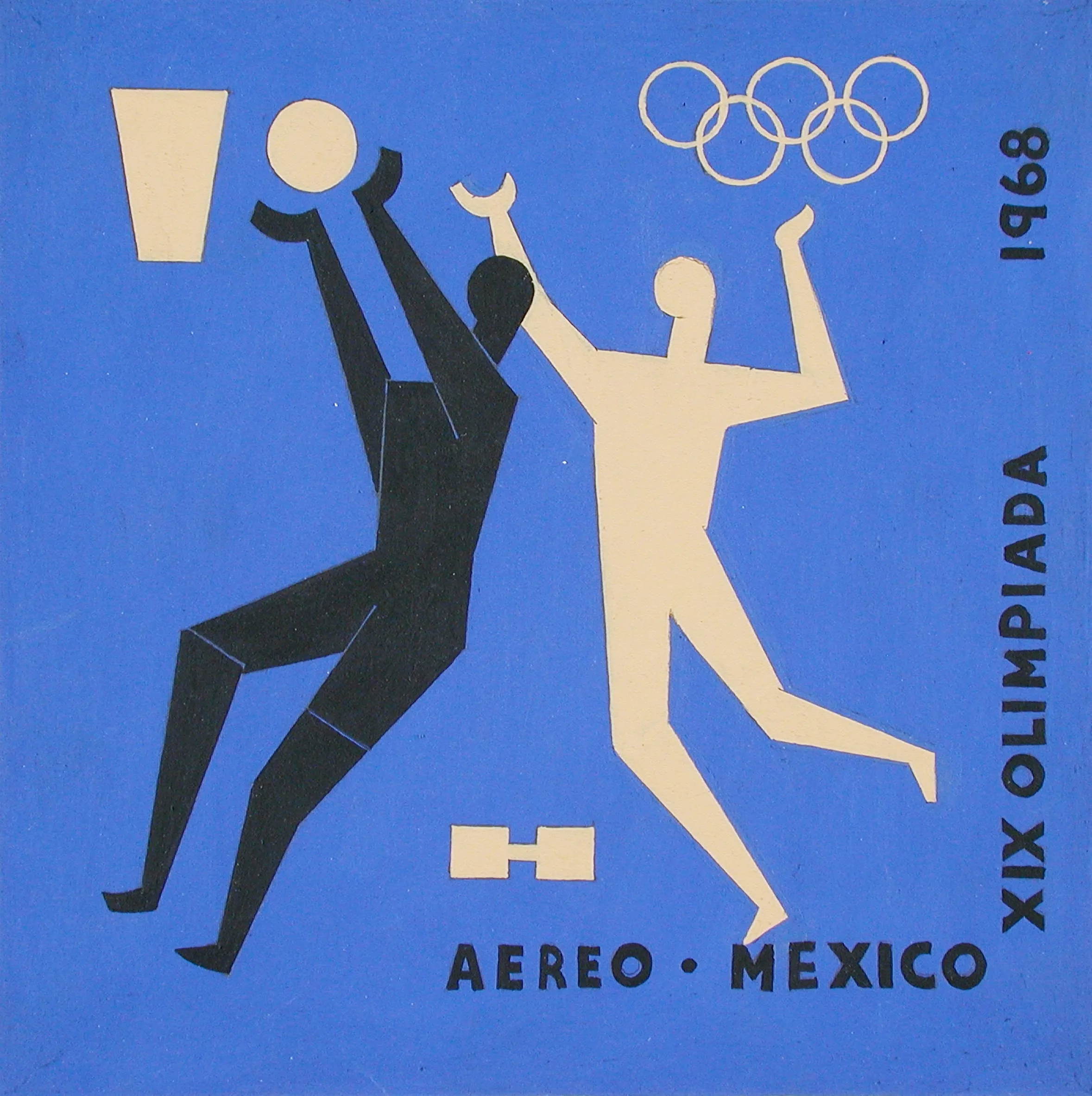 The production of stamps is an Olympic tradition that harks back to 1896, when the modern games first resumed. For this event, Greece issued a set of twelve stamps, one for each competitive event. Since then, both host nations and participating countries issue postage stamps to commemorate the games. In 1968 Mexico issued several series of stamps with illustrations of pre-Hispanic ceramics referencing competitive sports, sketches of athletic themes by Diego Rivera, and silhouettes of athletes by Lance Wyman (b. 1937), an American graphic designer responsible for the iconic Mexico ’68 logotype. Carlos Mérida’s studies illustrate various competitive events as well as the iconic Olympic rings. His proposed postage stamps are representative of the artist’s later style, with an emphasis on geometric shapes and bold colors. While it appears that the Organizing Committee did not select Mérida’s designs, the images are emblematic of the distinct branding adopted for the games.