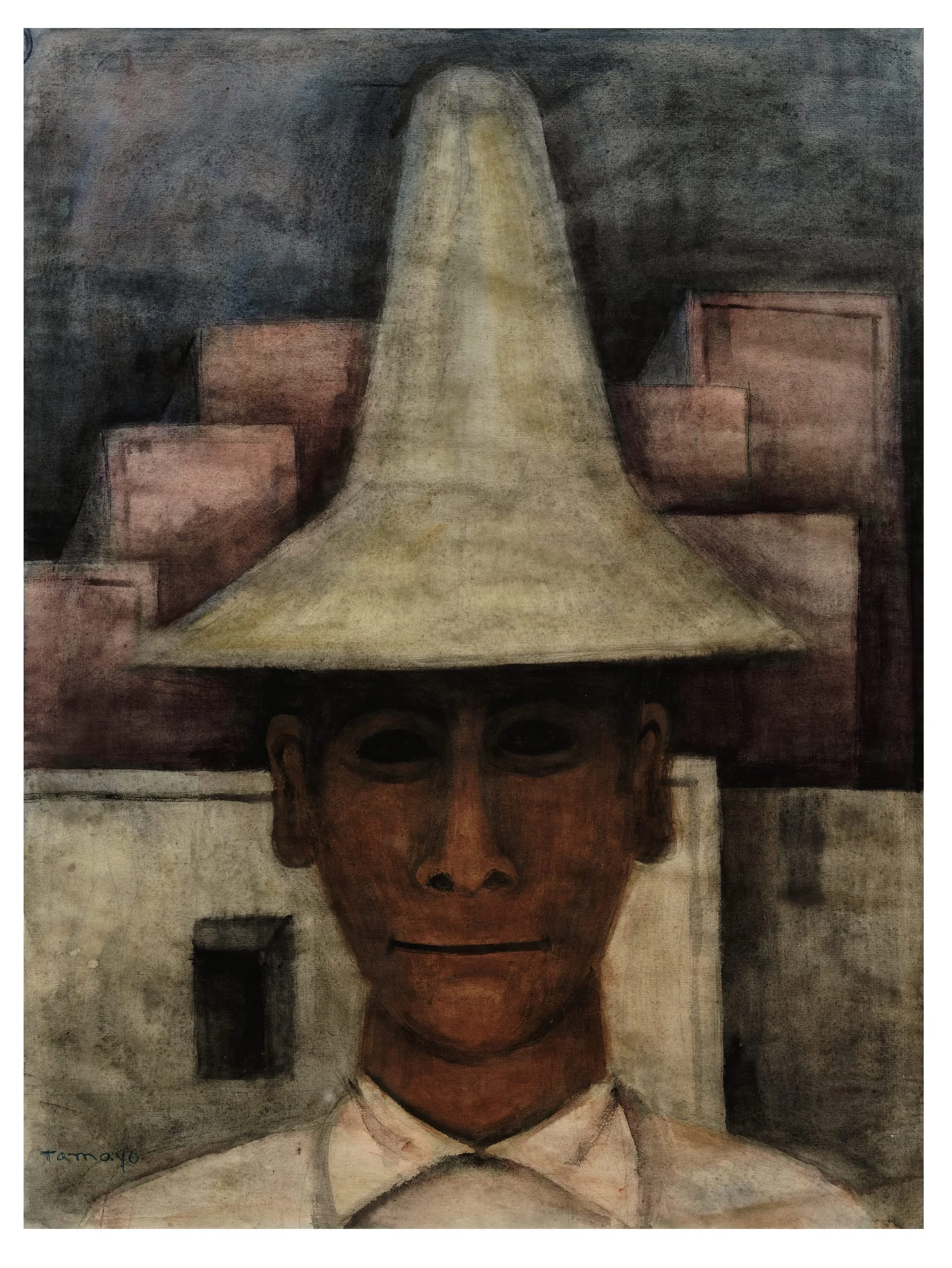 Works on paper of Mexican scenes and Indigenous subjects were popular among collectors in the United States in the 1930s, and helped to support Rufino Tamayo financially as he worked on larger and more experimental canvases. At the same time, Man with Tall Hat rejects many of the conventions expected by this market that was greatly interested in exotic themes. Rather than using bright colors, Tamayo’s muted palette is drawn from neutral earth tones. The subject is not presented in a folkloric narrative—such as working or dancing—but rather is presented as an intimate bust, facing the viewer. The stacked homes behind the man are a nod to Cubist landscapes, suggesting transnational visual connections beyond Mexico. The signature hat dominates the composition, larger even than the face of the subject, whose stylized features suggest that this is not a specific individual.