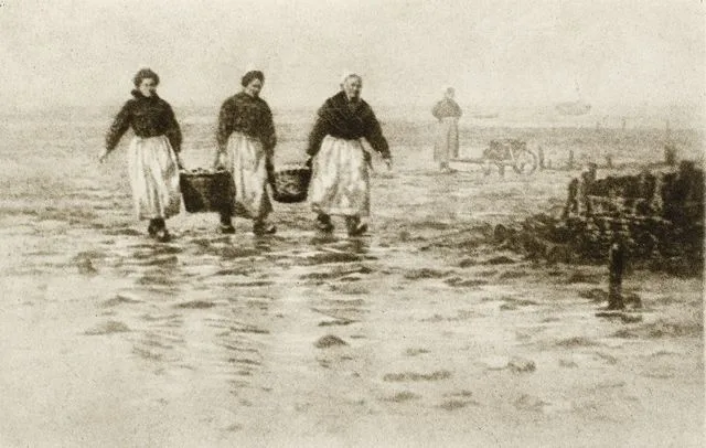 The photographer has created a soft, dreamlike image of women gathering oysters by the shore. The women's simple clothes and competent demeanor imply that this is a common chore for them. The romantic style of the photograph emphasizes the pre-industrial, timeless nature of the women's labor.