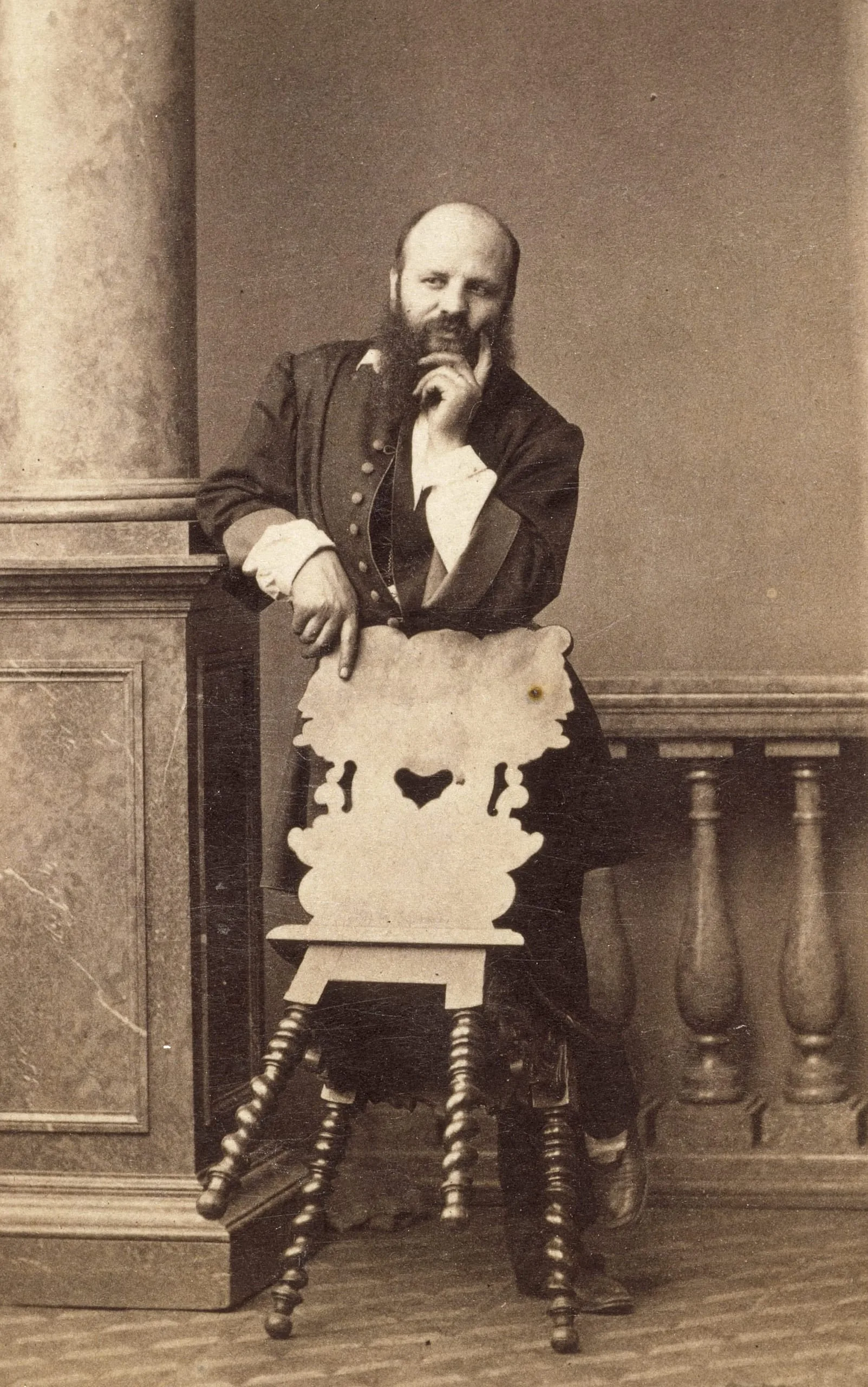 Primarily portraits, cartes de visite—small cards presented when making social calls or given to friends and relatives to keep in albums—announced the status or aspirations of the subject using socially understood cues of clothing, props, and body language. In this self-portrait, André Adolphe Eugène Disdéri, the inventor of the carte de visite, wanted to appear as a bohemian and an entertainer, fitting for a man described in Paris newspapers as an "egoist, a dandified dresser and poseur, and an extravagant spendthrift."¹ Disdéri was also the subject of caricatures in the press that emphasized his bald head, full beard, and the artist-style jacket and neck cloth he wore when operating the camera, emblematic of his theatrical personality. While using the typical props of a nineteenth-century portrait studio—the column, balustrade, and chairhe adopts a casual and self-assured body language. As was common in cartes de visite, Disdéri gazes away from the camera, appearing to be captured in thought, even as the viewer notes the conscious construction of the scene.