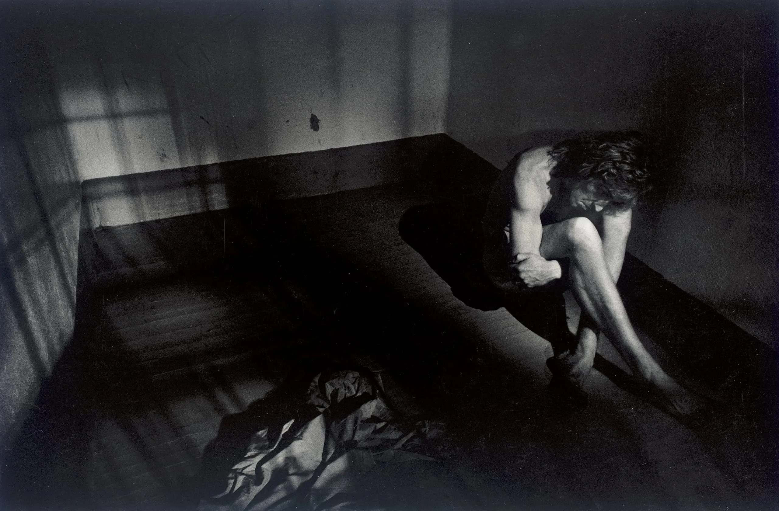 Black and white photograph of a pale-skinned figure sitting curled on a bare floor in a shadowed corner, head bowed, knees drawn to chest, lit by strong directional light casting window-pane shadows
