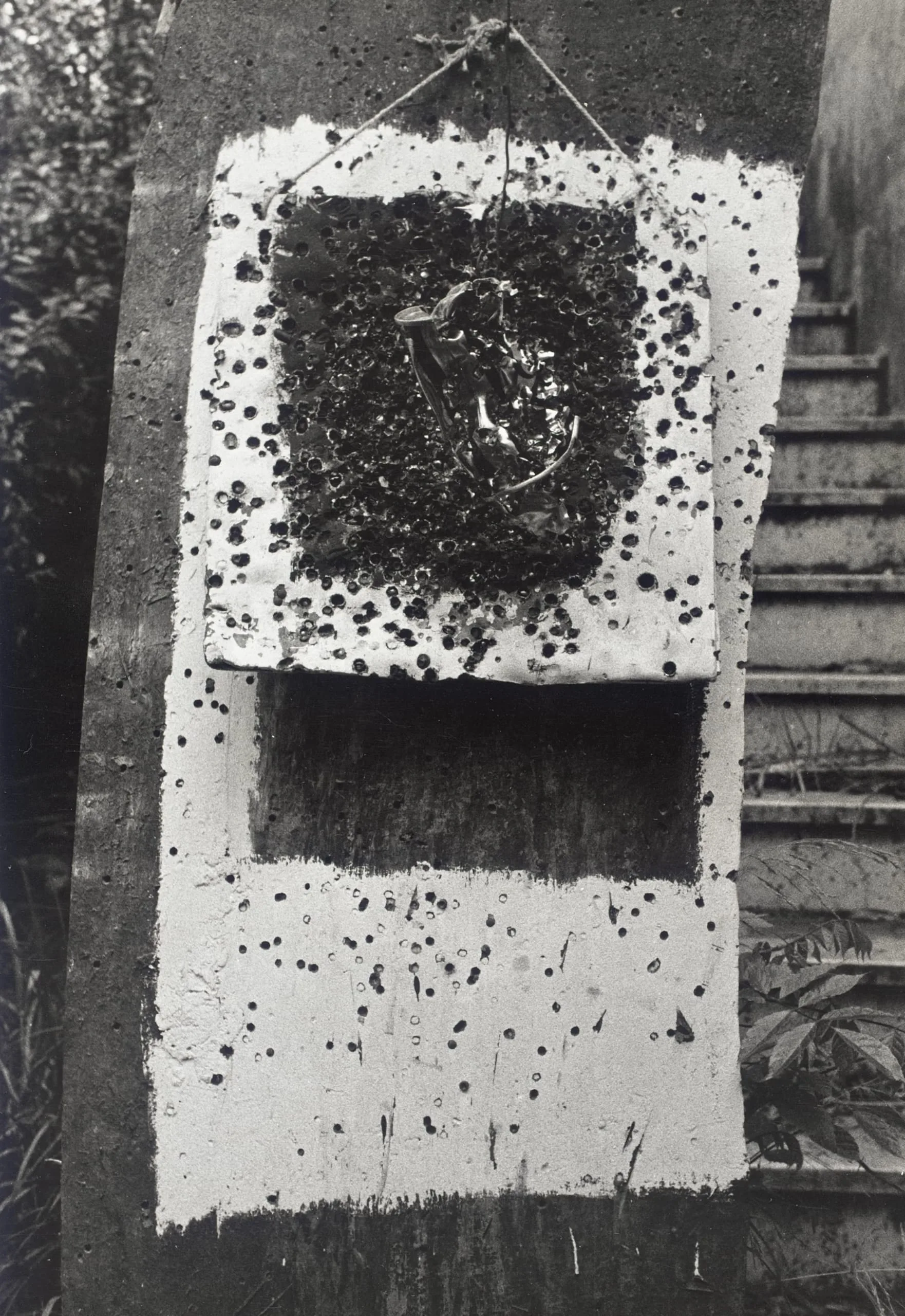 Black and white photograph of a white rectangular panel with bullet-hole-like perforations, hung from a post outdoors, with tangled organic material embedded in its upper section