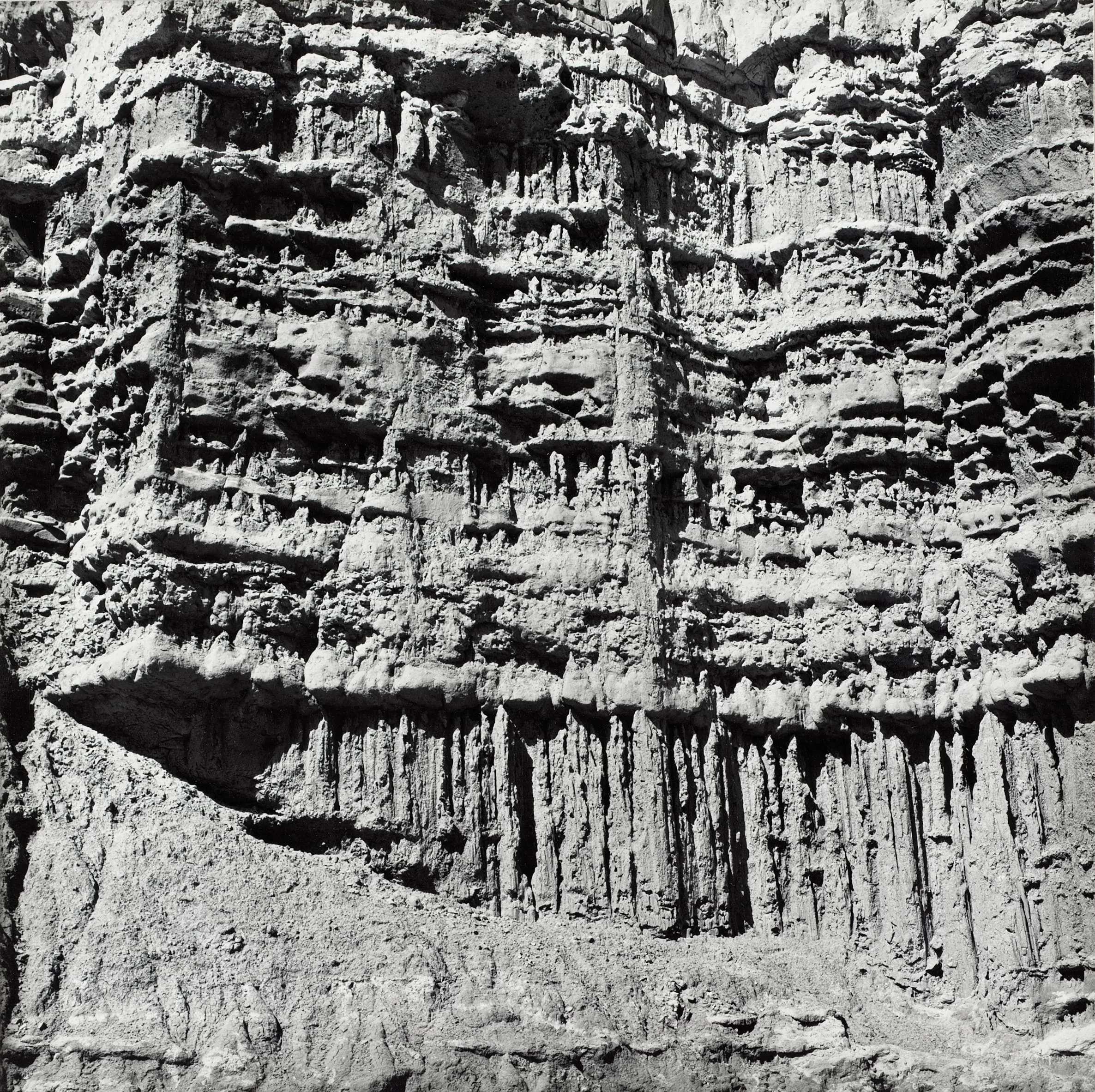 Square black and white photograph of a close-up eroded rock face with horizontal strata, a shadowed overhang, and densely packed vertical stone columns