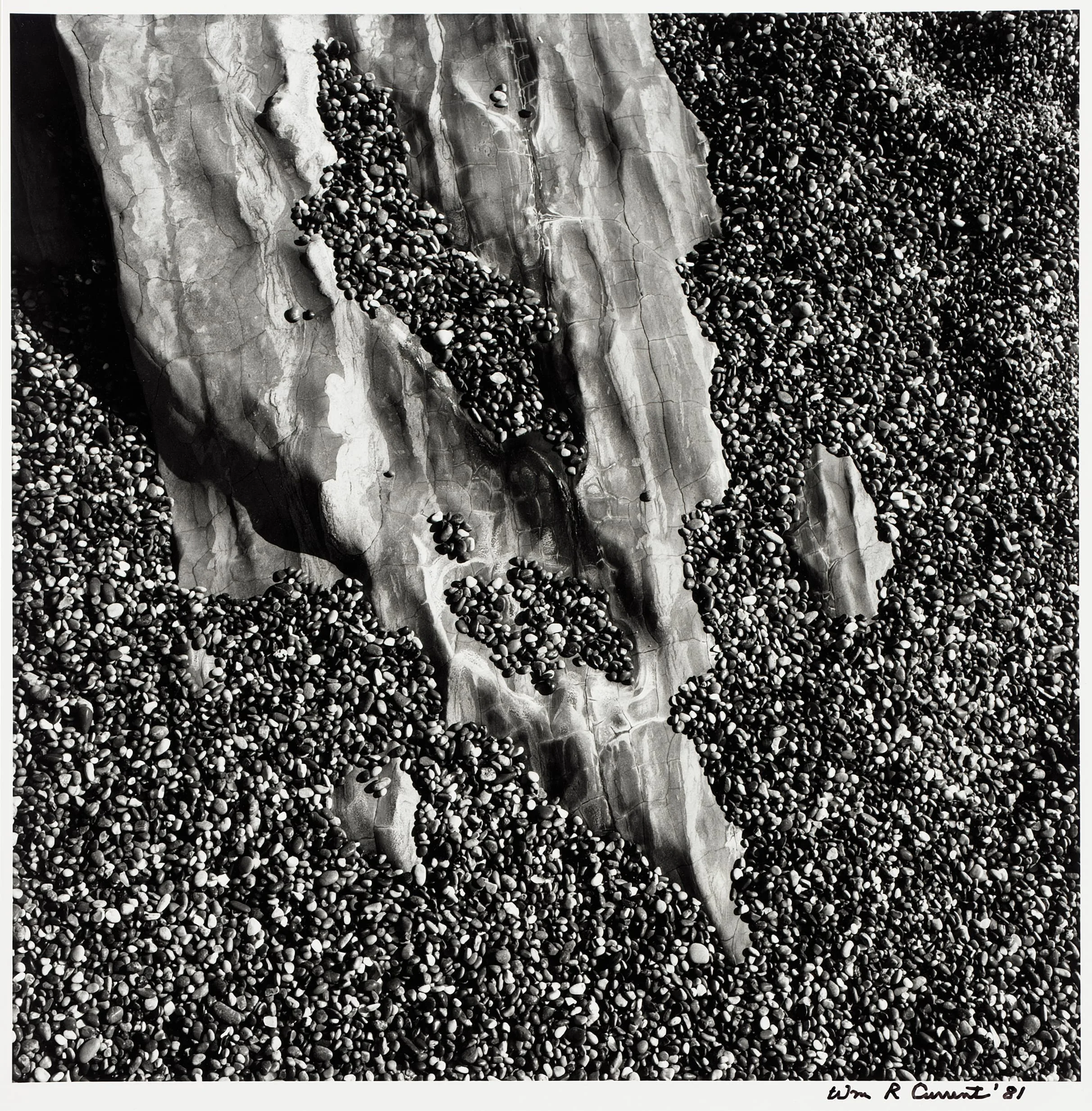 Black and white photograph looking straight down at a striated rock slab with pebble-filled crevices surrounded by a dense field of small rounded stones